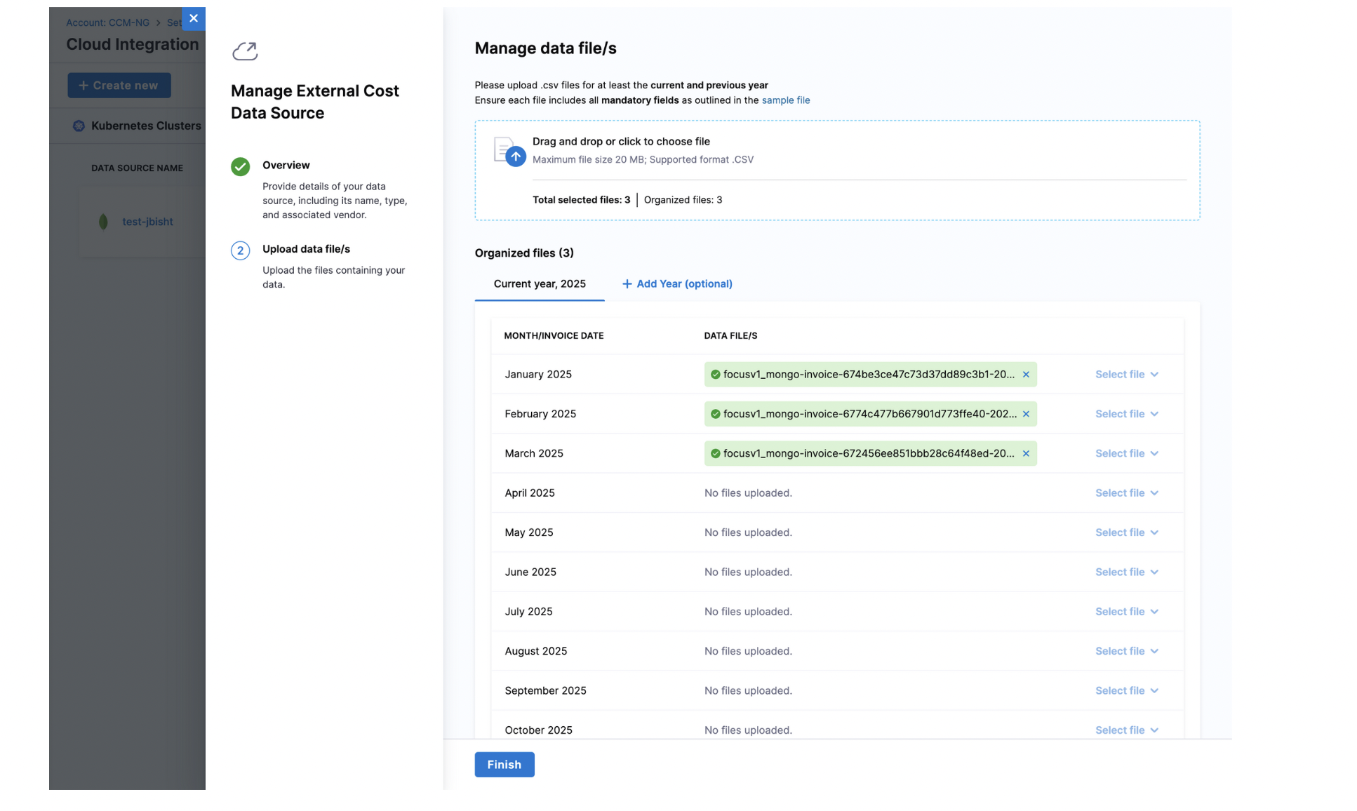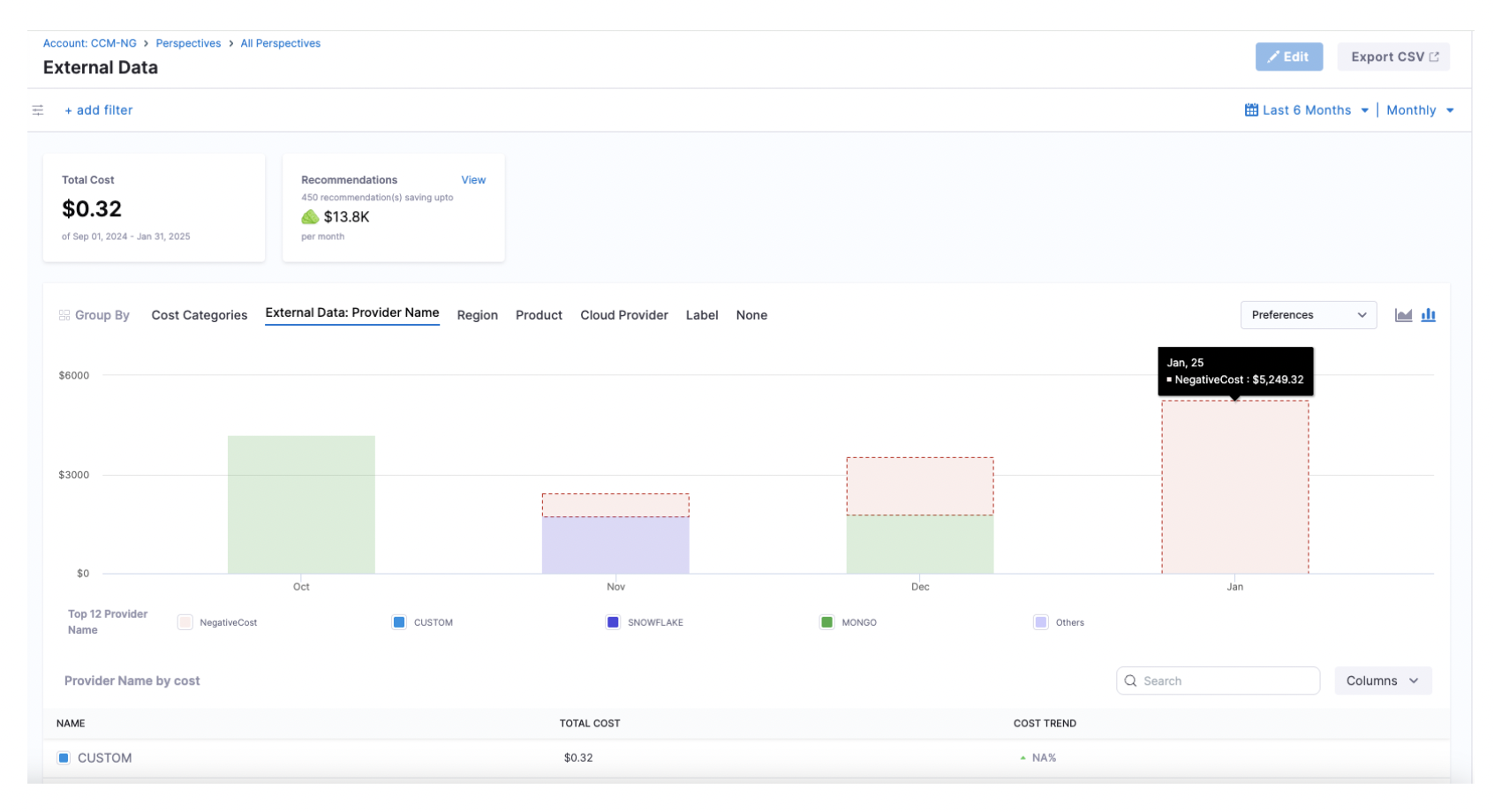 External Cost Data Ingestion allows users to bring cost data from third-party vendors such as Mongo, Snowflake, etc., into Harness Cloud Cost Management (CCM). This allows users to see unified visibility and analysis across their cloud and external spend. Instead of managing these costs in spreadsheets or siloed tools, users can now consolidate them in Harness CCM for a single source of truth across all the cloud and non-cloud spend.
