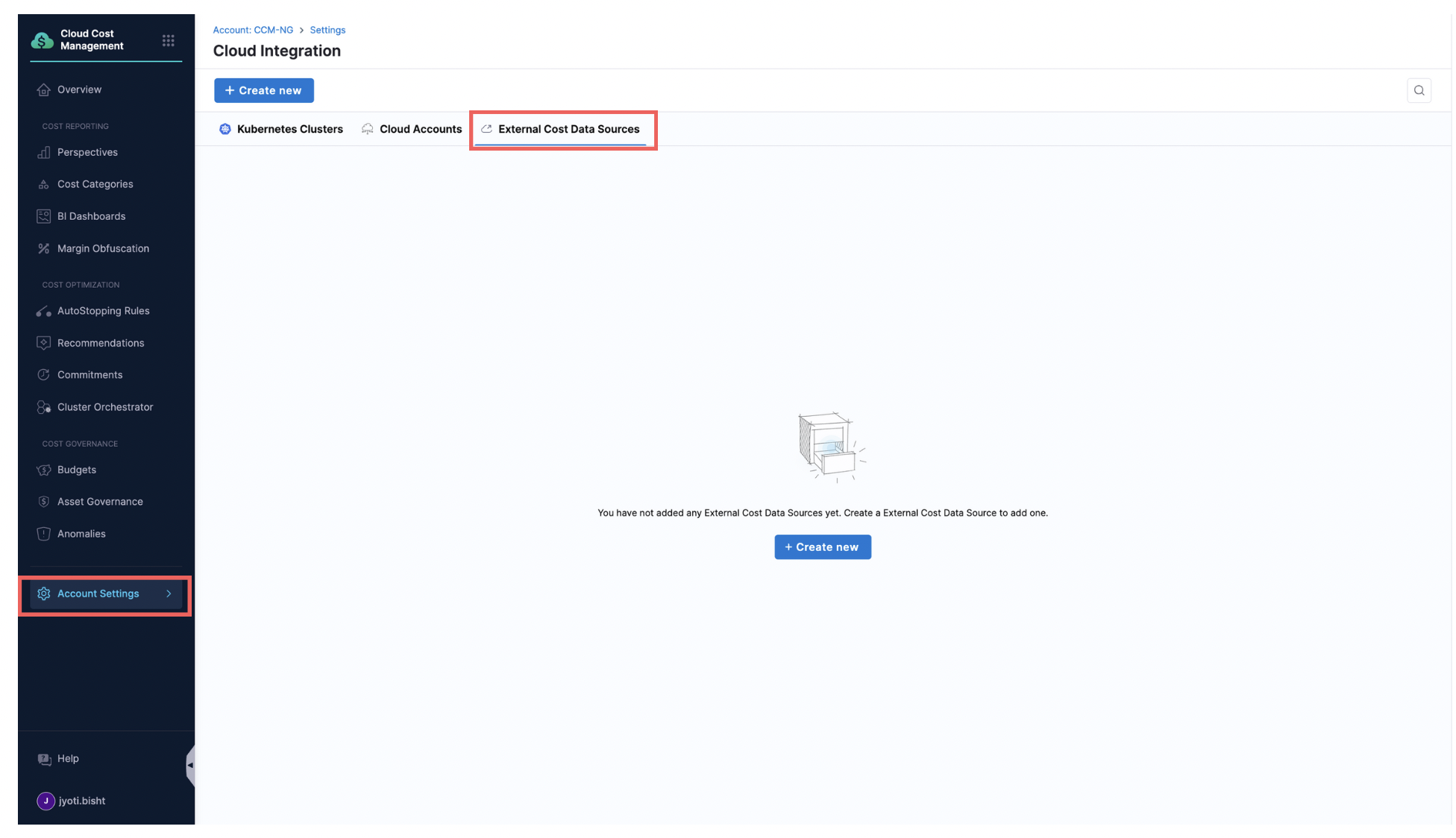 Step 1: Navigate to "Account Settings" in the navigatation bar. Then click on "External Data Sources". Step 2: Click on "+Create New".