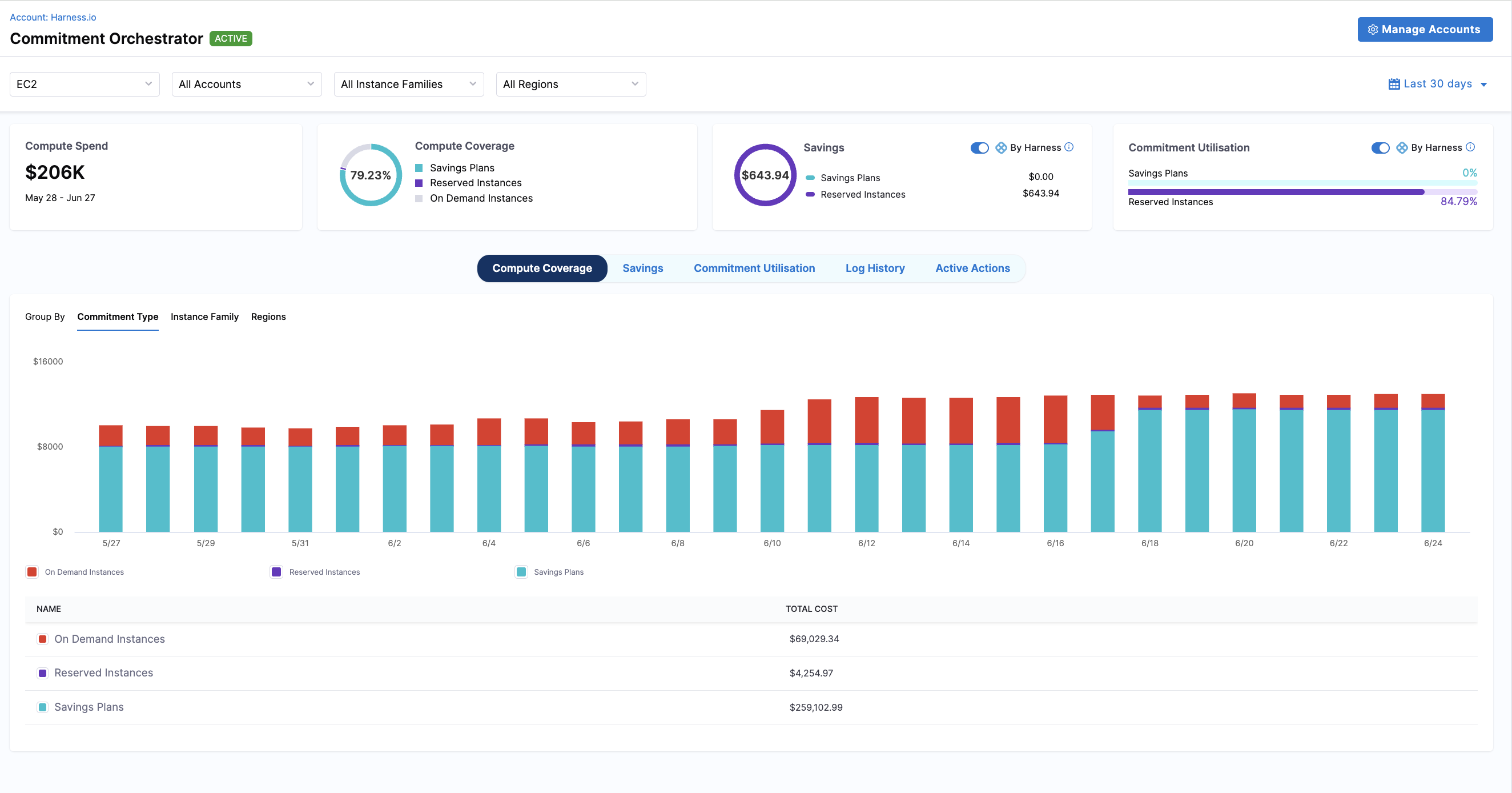 Post set-up, you can view your dashboard with all the information required . You can manipulate the information shown according to the filters such as Instances and Regions and see all the information related to Computer Coverage, Savings, Commitment Utilisation alongwith Log history. This way, the dashboard allows you to easily keep a track of your commitments and make informed decisions.