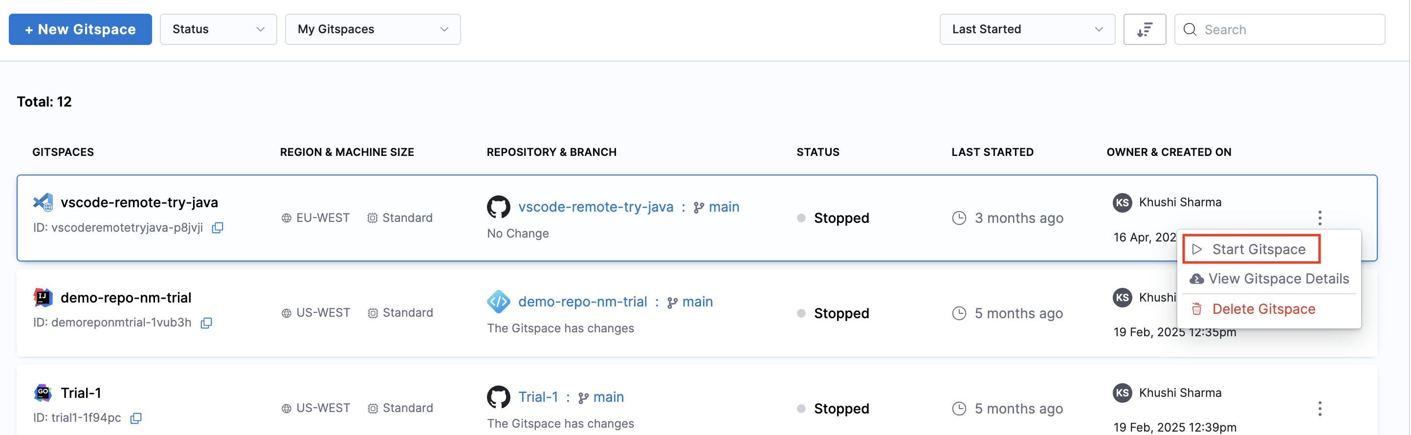 - On the Gitspaces Dashboard, for any stopped Gitspace, click on the 3 dots menu and select Start Gitspace.