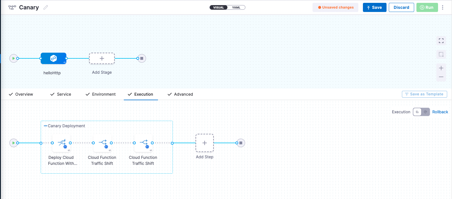 harness pipeline --file "/google_cloud_function/2nd_gen/canary-pipeline.yml" apply - In Harness, you can switch to the Visual editor and confirm the pipeline stage and execution steps as shown below.