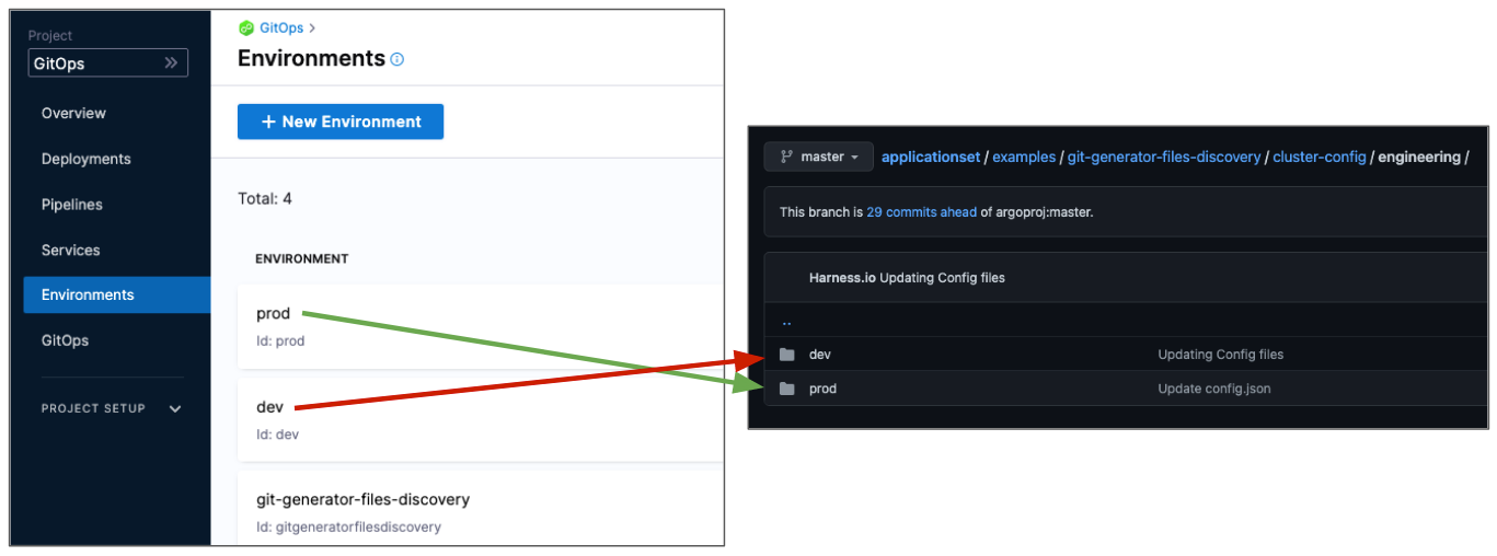 A Harness service logically corresponds to a microservice/application template in an ApplicationSet. Together with the environment and cluster entities, Harness resolves application config.json files in a Git repository to update manifest values through PR pipelines.