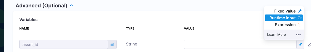 3. For variable Value, select Runtime Input: