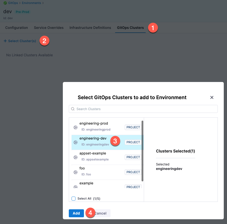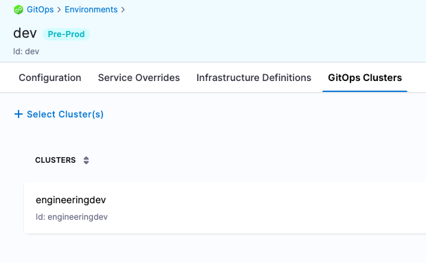 Once you link GitOps clusters to an environment, whenever you select an environment in a pipeline, you can select the environment's linked GitOps clusters. This ensures that you can control where applications are to be updated even within the same environment.