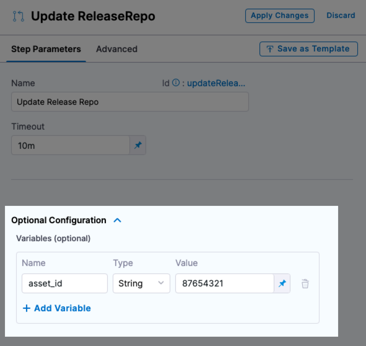 3. In Environment Variables, for asset_id, enter the value 12345678.