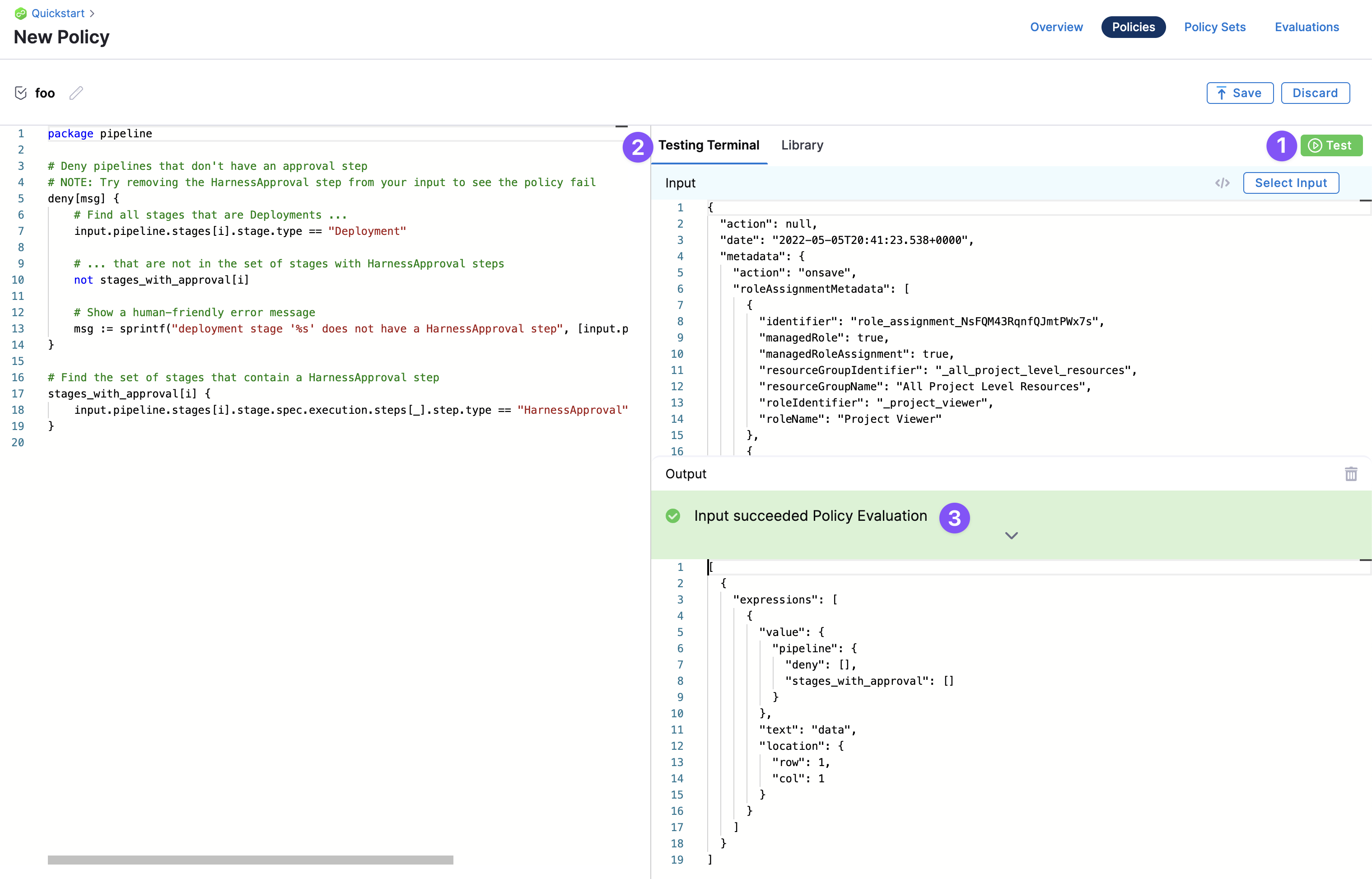 The Testing Terminal lets you test the policy against real inputs while you're developing it. You can select input payloads from previous evaluations to test what will happen when your policy is evaluated.