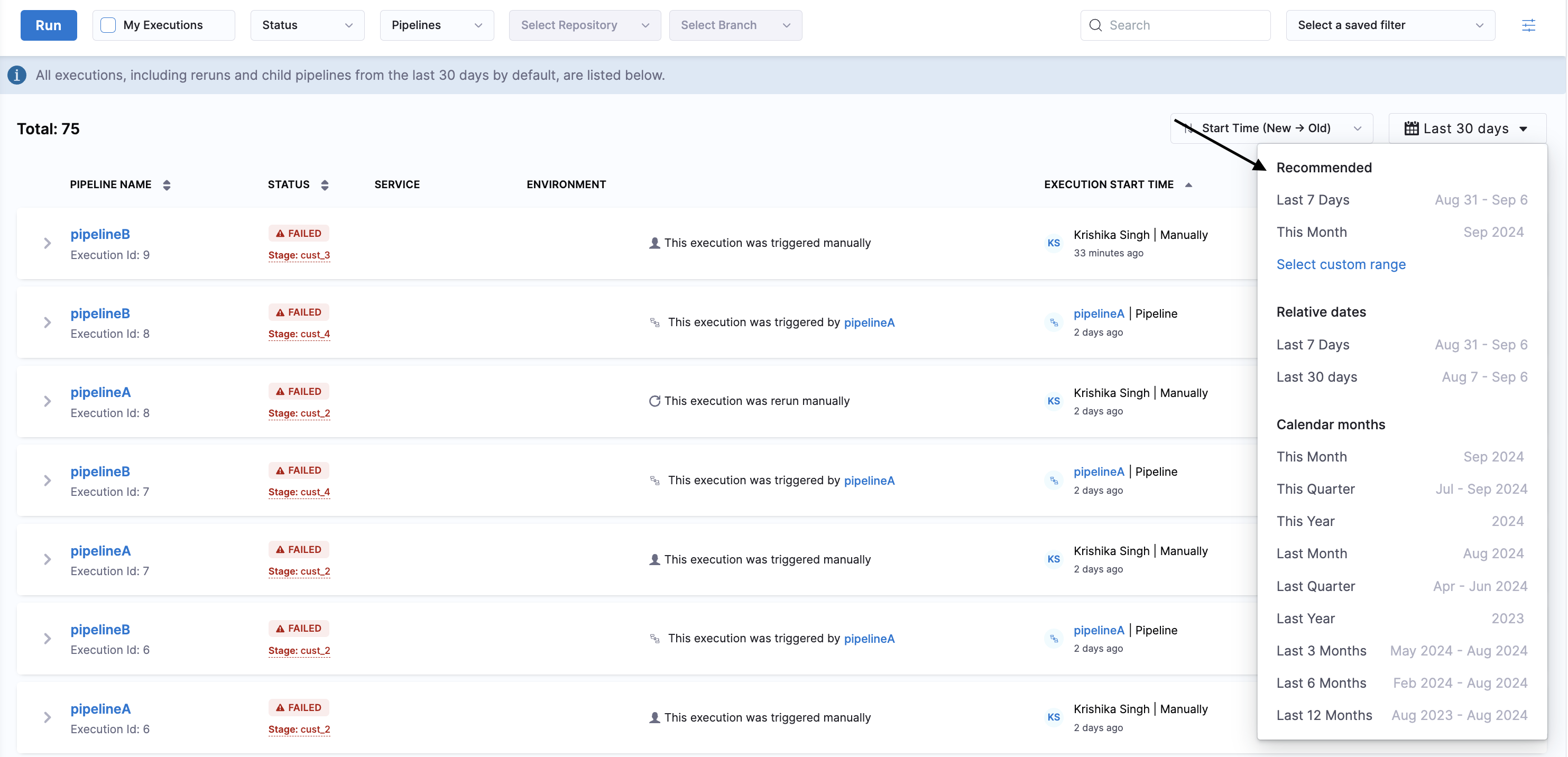By default, all executions, including re-runs and child pipelines from the last 30 days, will be listed in the execution view. If you want to view executions beyond 30 days, you can use the filter option available on the Execution page to select a custom time range.