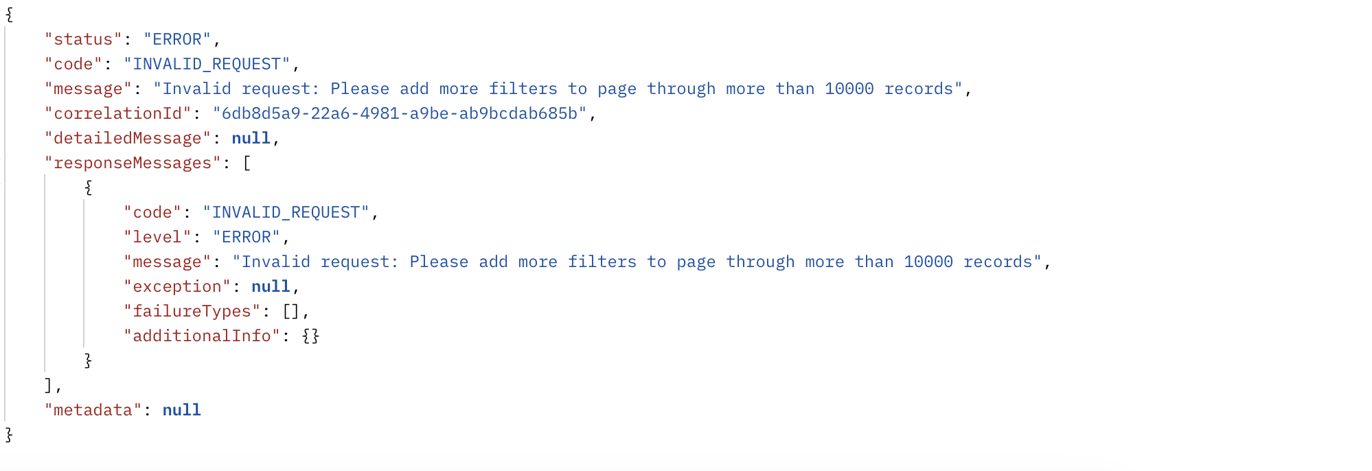 Due to the underlying technical implementation, the API cannot retrieve records beyond the 10,000th execution, even if the page size is increased. If the results exceed this limit, an error will be encountered.