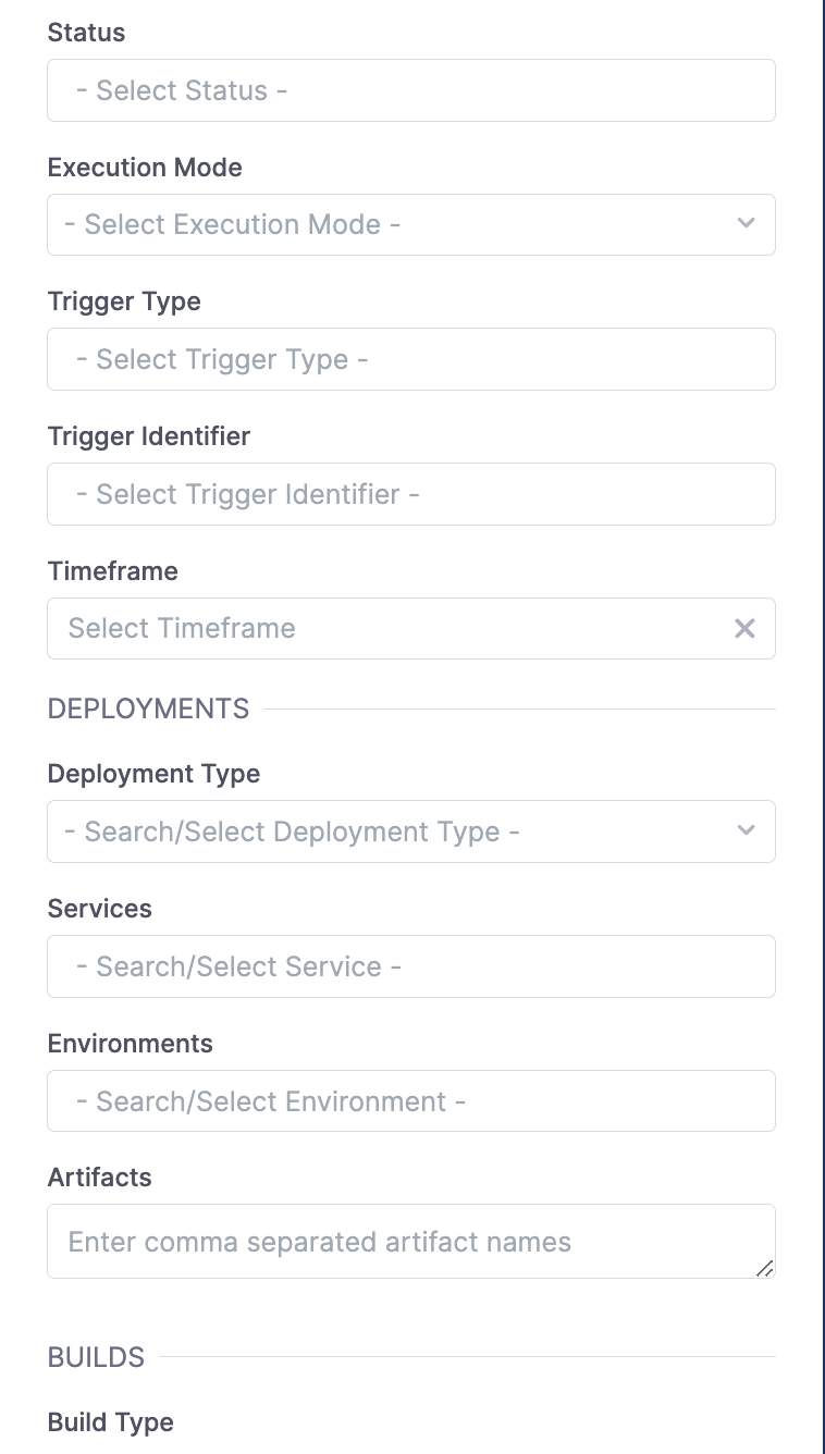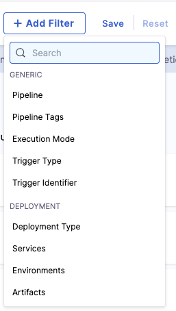 You can filter pipeline execution based on Status, Execution Mode, Trigger Type, Trigger Identifier, Timeframe, Deployment Type, Services, Environments, Artifacts or Build Type.