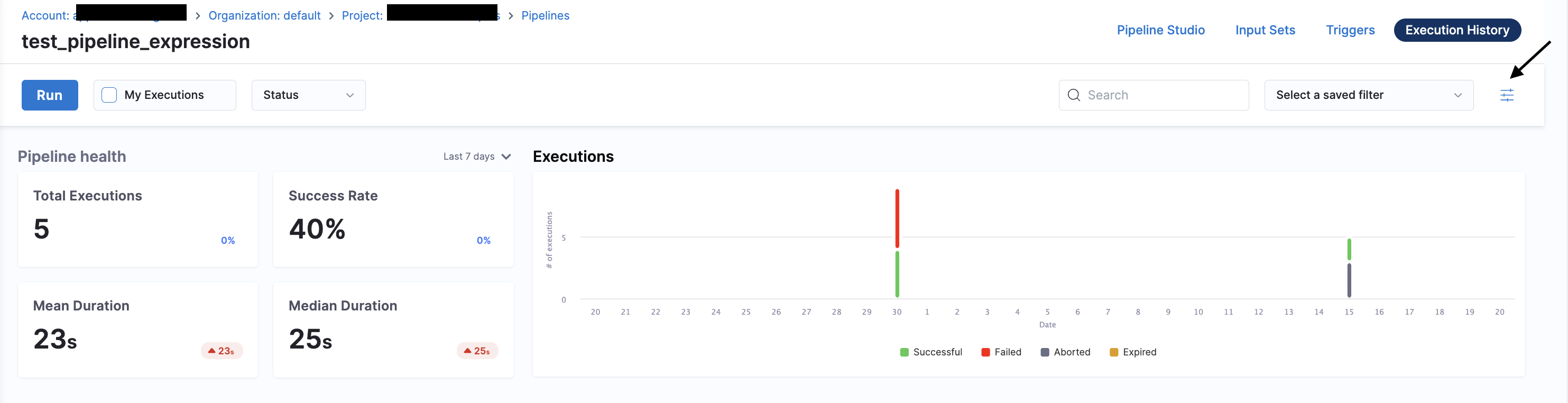 You can filter pipeline executions using the filters in the Execution History or Execution tabs.