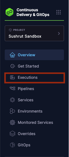 You can view the execution history of all pipelines for a given project in the Executions tab in the left navigation of the Harness UI: