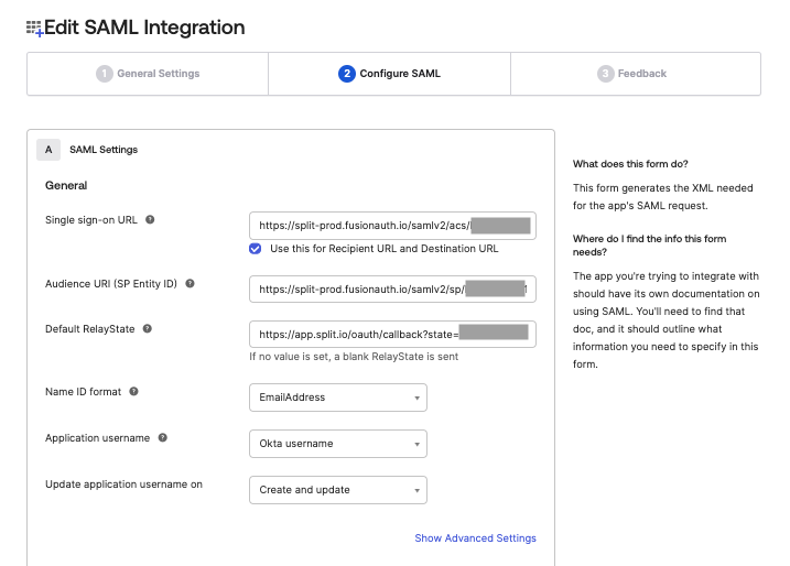 • Set a temporary Audience URI (SP Entity ID). You will also get the real value during the Split configuration and change it later.