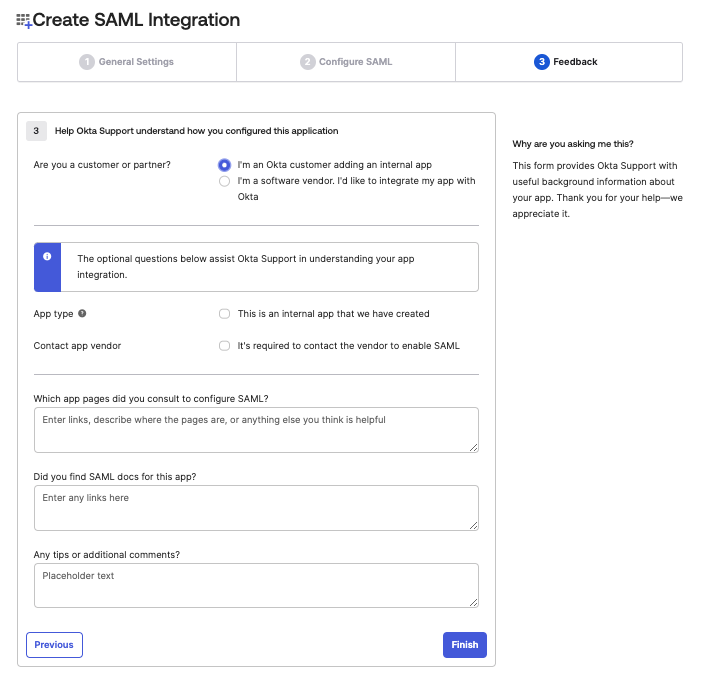 8. Before finishing, select I'm an Okta customer adding an internal app.