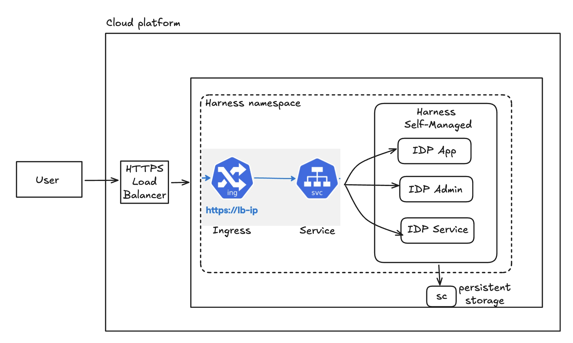 The Self-Managed Enterprise Edition runs within the customer’s environment alongside existing services. You must have a Kubernetes cluster with a configured load balancer. Harness IDP is supported on SMP only when the control plane is deployed on Google Cloud Platform (GCP) using Google Kubernetes Engine (GKE). Deployments on AWS (EKS), Azure (AKS), on-prem, or OpenShift are not supported.