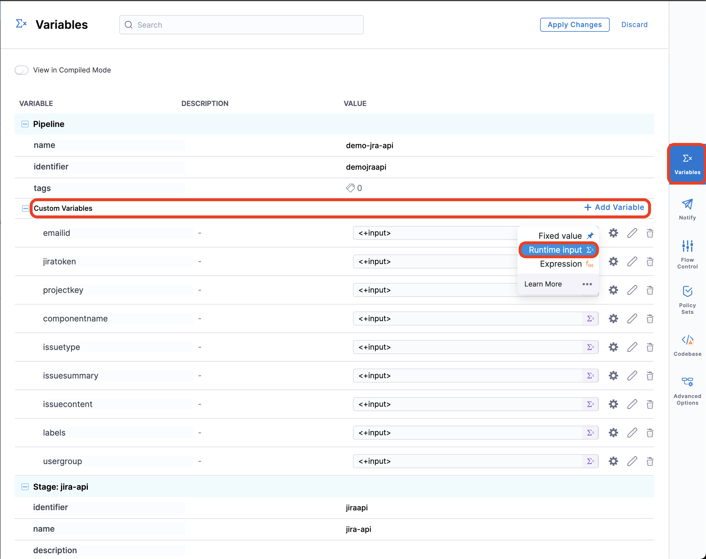 3. Go to Variables on the right side of the page and add the following variables and have the input type as Runtime Input.