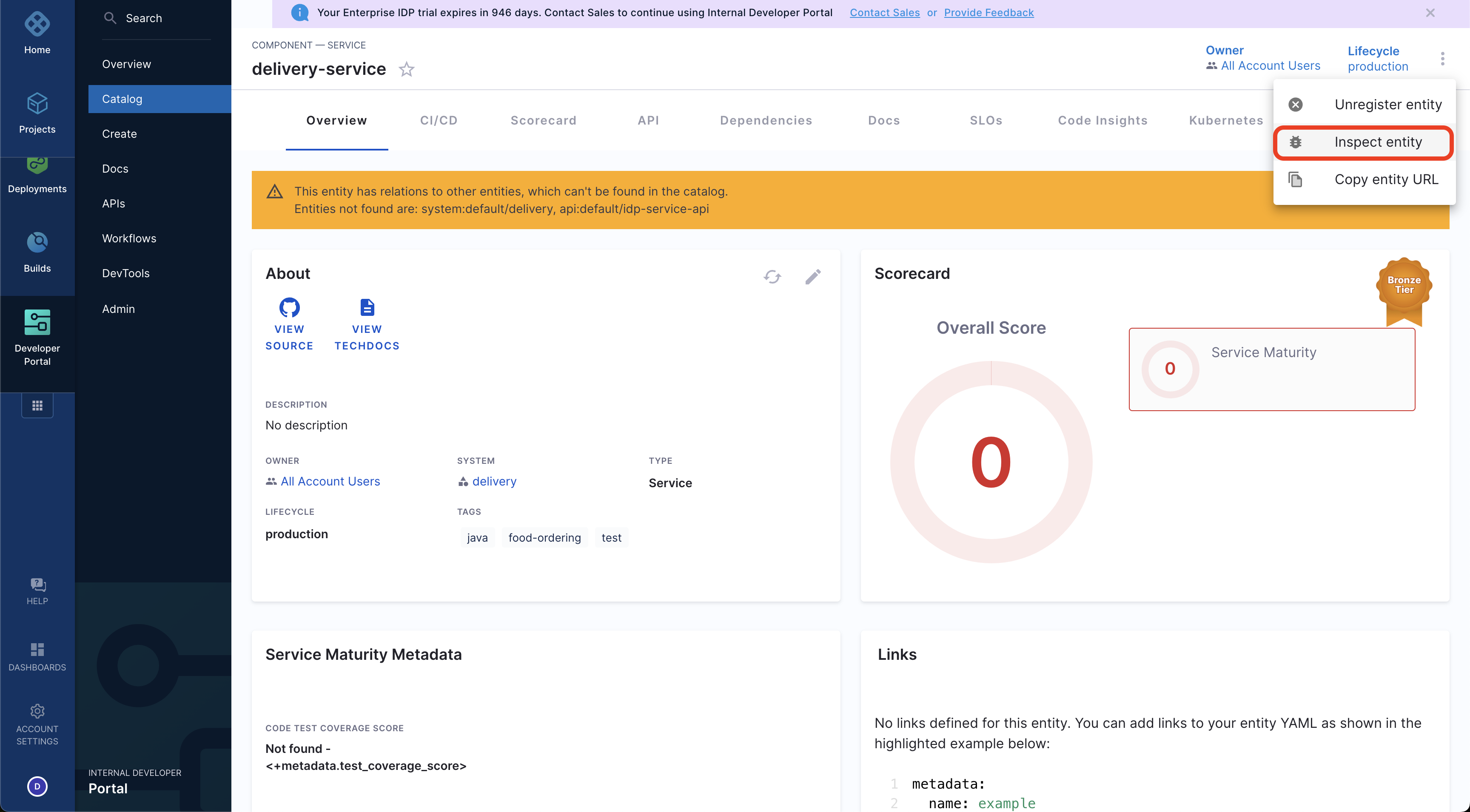 1. Now go to the Software Component in the Catalog and you'll find an additional info card populated with information we ingested using the API above. You can read more about additional info card