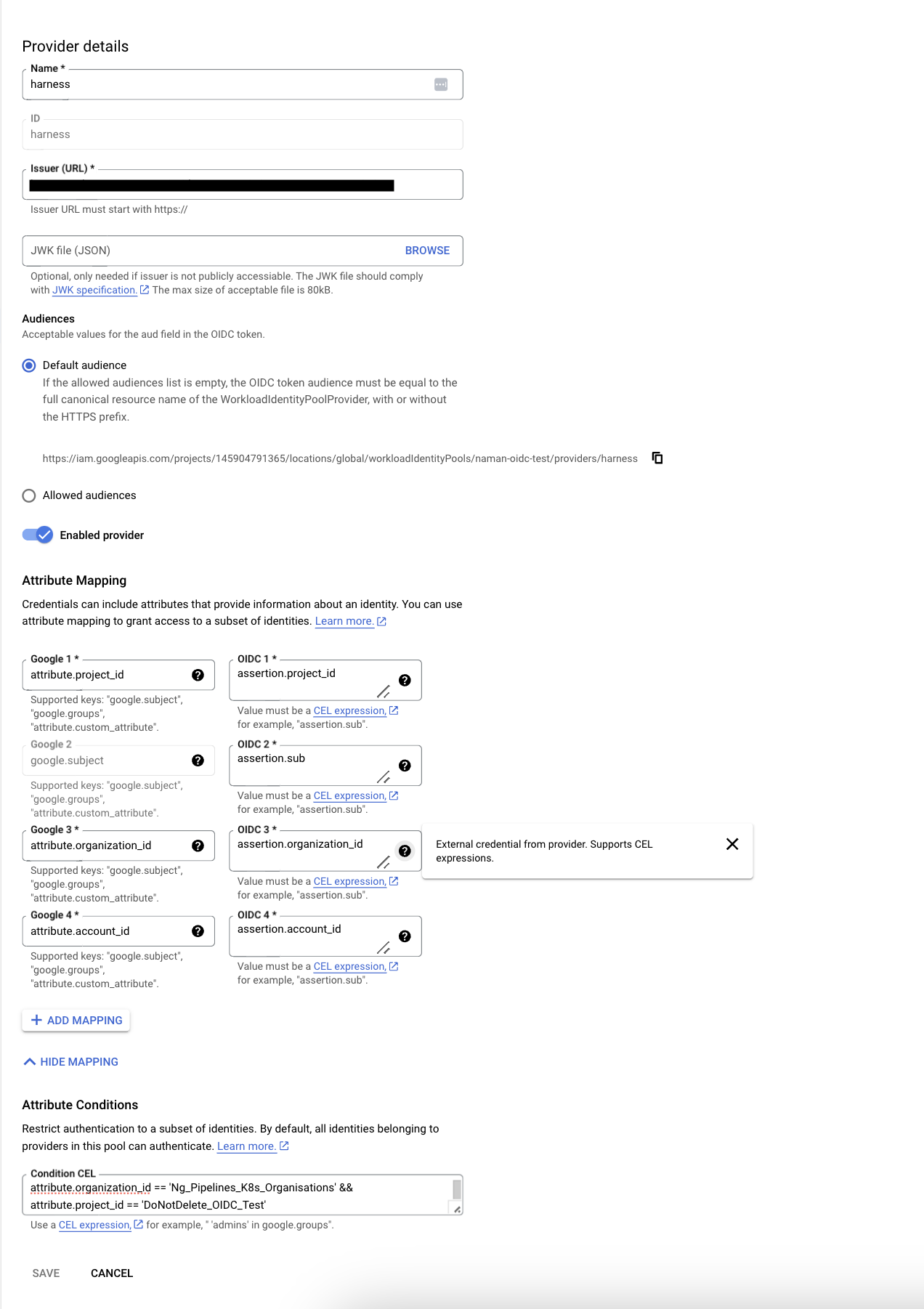 • Provider ID: projects/421331508843/locations/global/workloadIdentityPools/harness-pool/providers/harness-provider