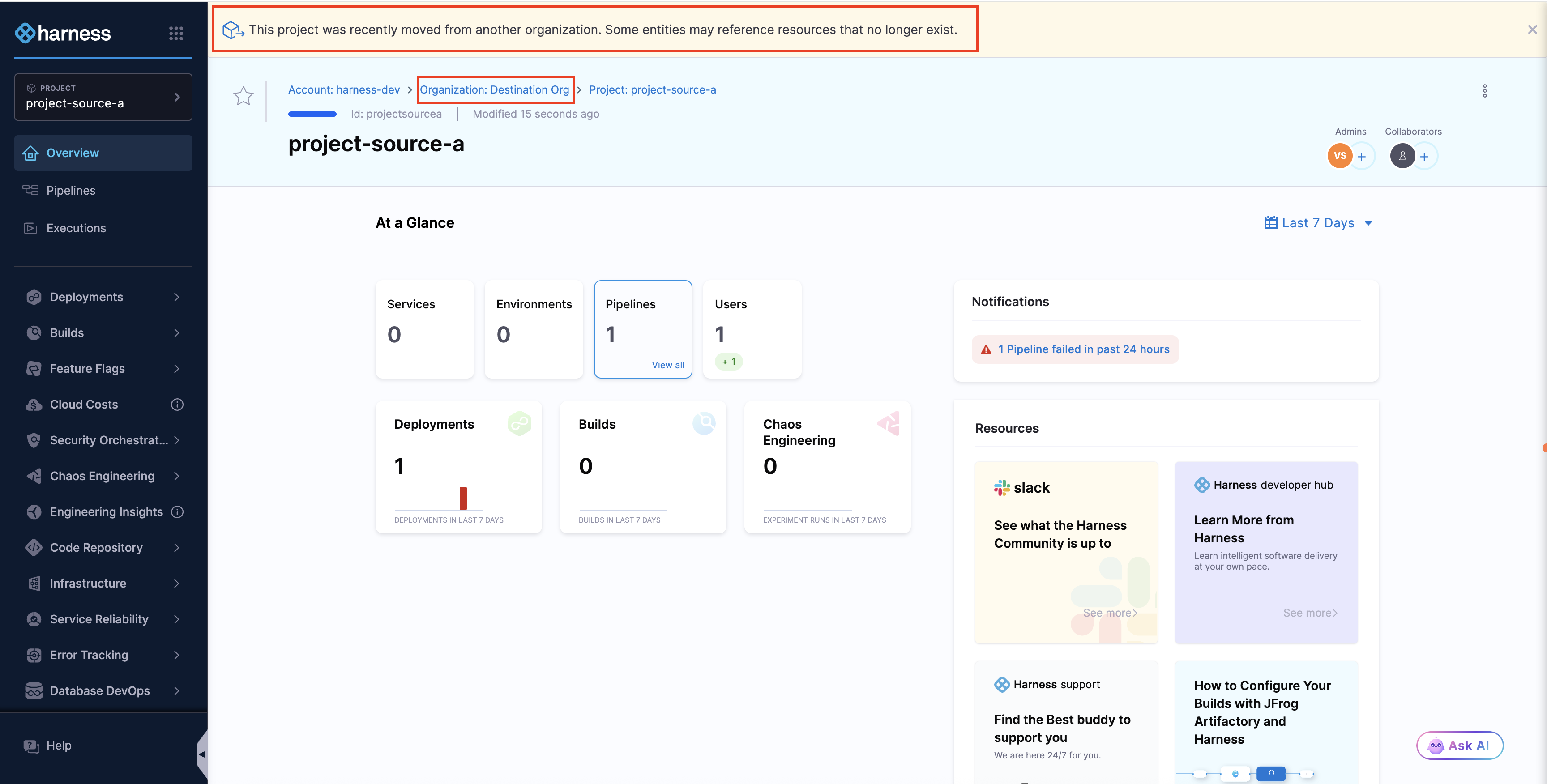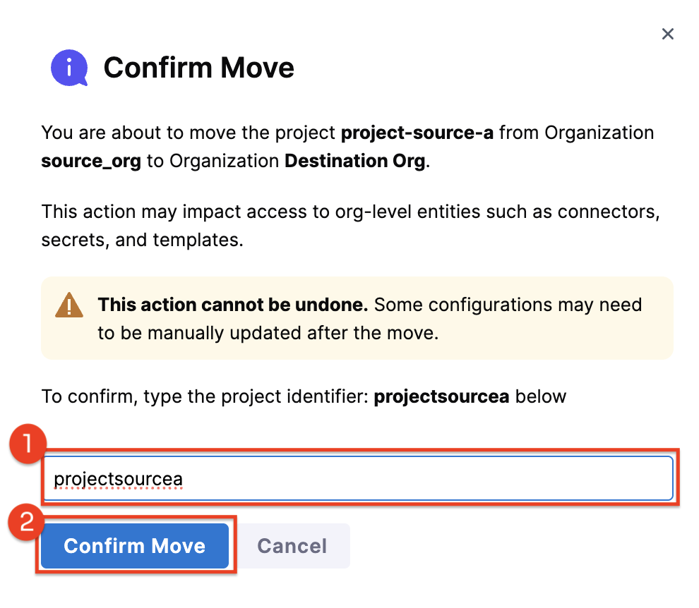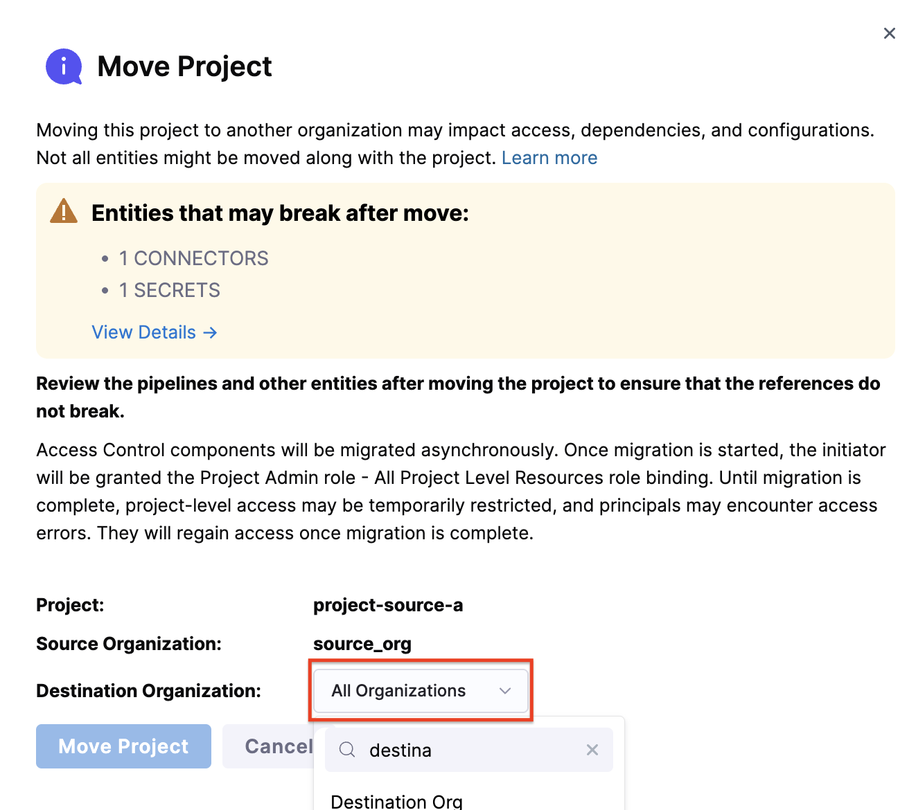 Once a project is moved, you'll be redirected to the project in its new organization. A banner will appear stating: This project was recently moved from another organization. Some entities may reference resources that no longer exist. and you can also view the new destination organization, as shown in the image below.