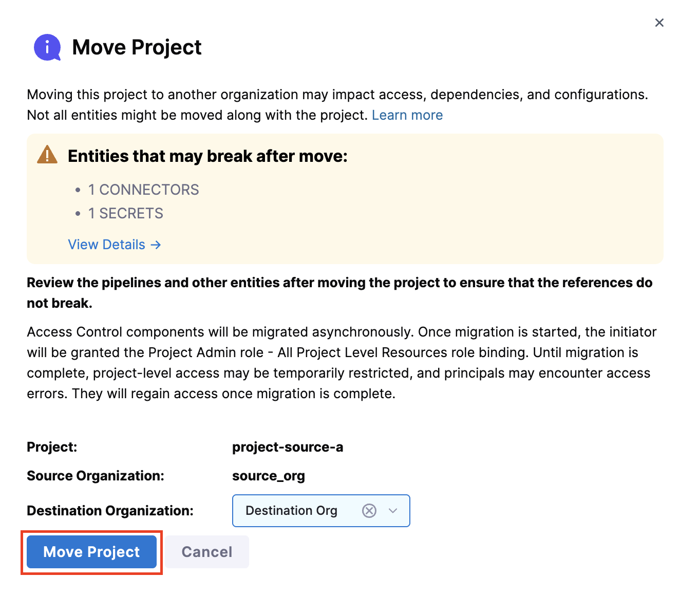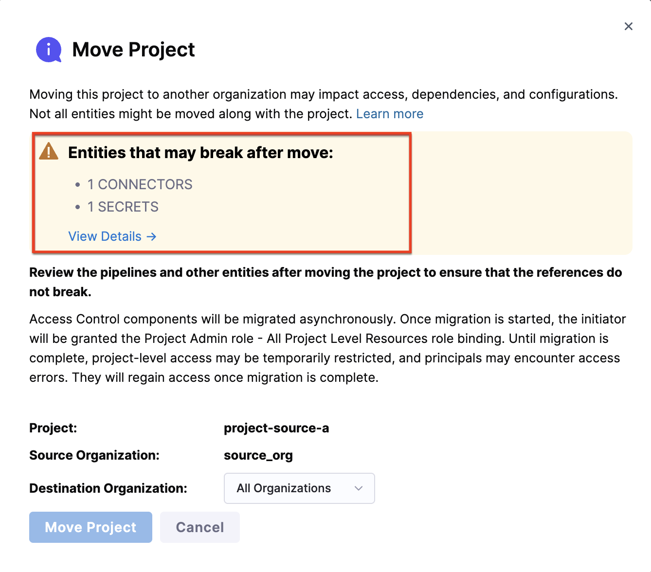 1. In the Move Project modal, review the warning about potential impacts and the list of entities that may break after the move. This list is not exhaustive, so additional entities might also be affected.