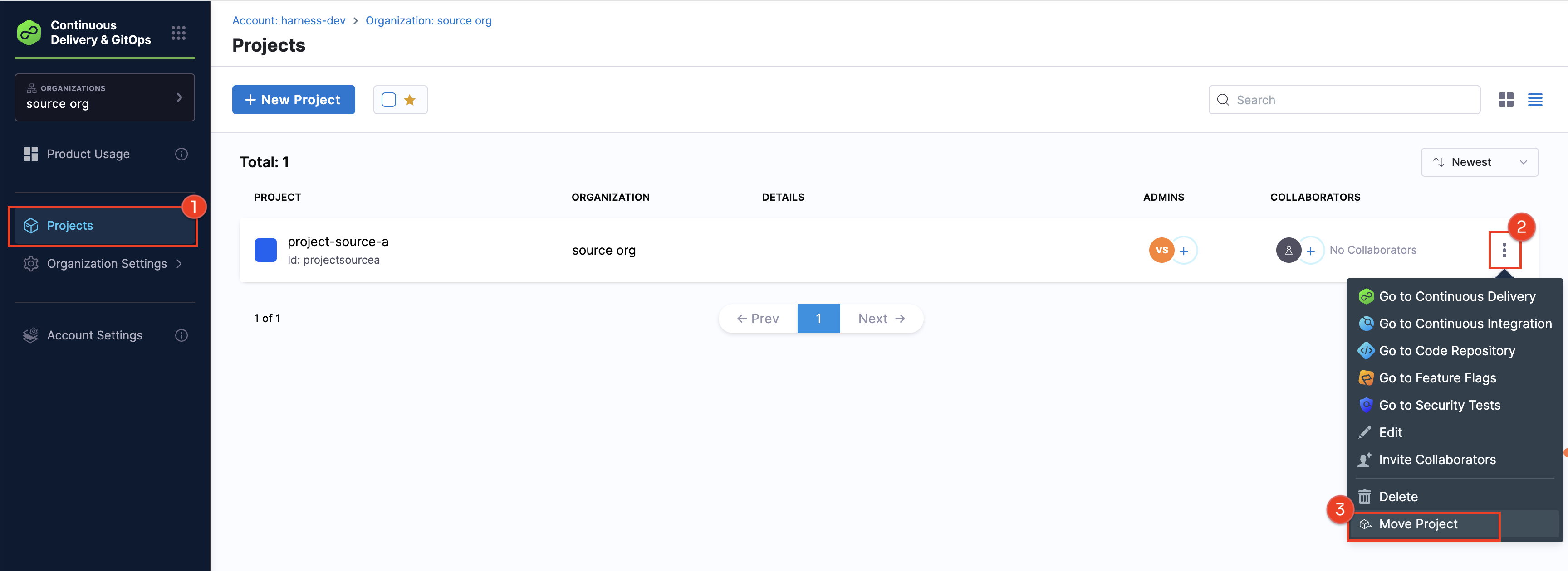 1. Navigate to the source organization in your account and locate the project you want to move.