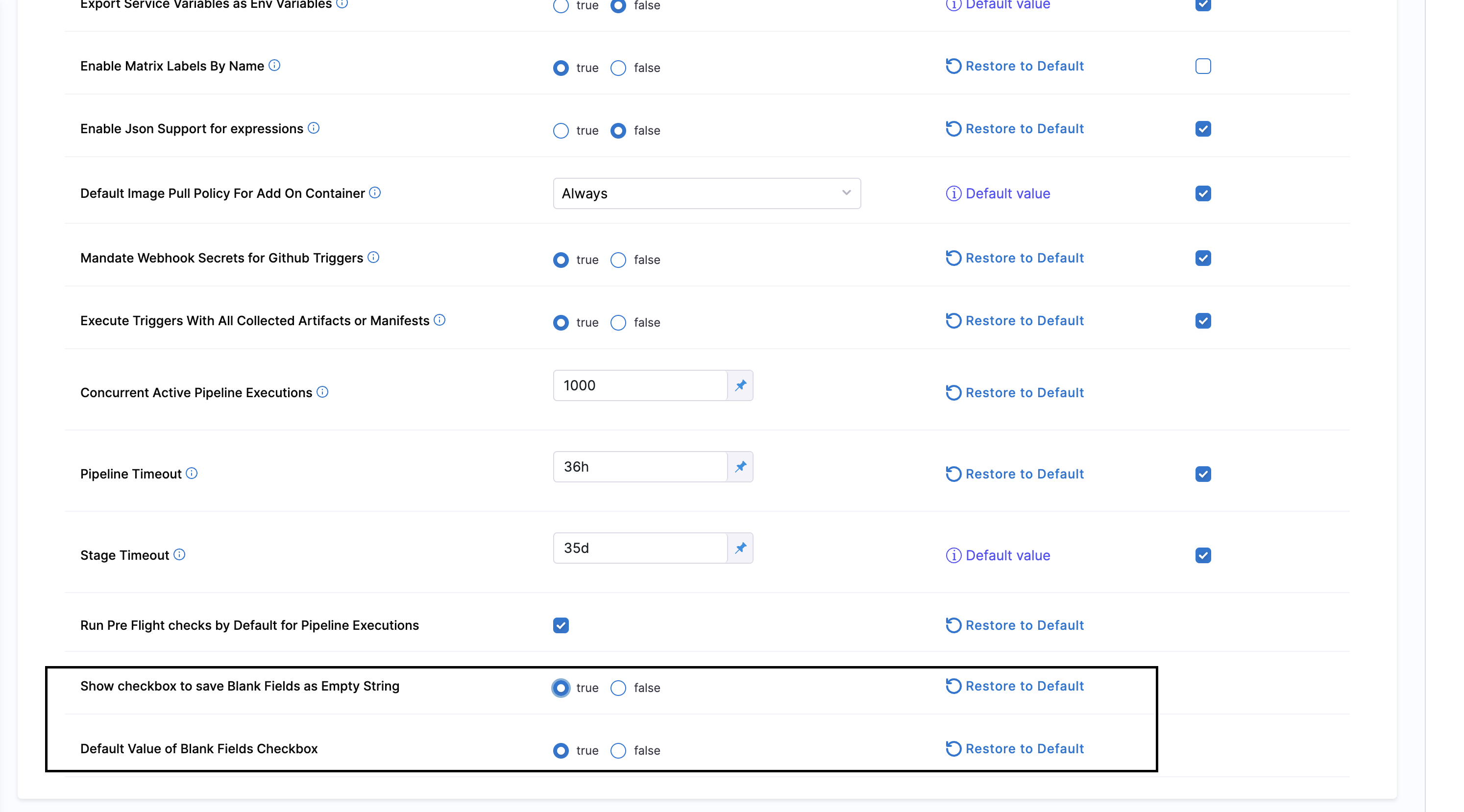 • Show checkbox to Save Blank Fields as Empty String: When enabled, this setting shows the checkbox Save Blank Fields as Empty String both when creating the input set in the Input Set section and when creating an input set in triggers, as well as in the Pipeline Run form.