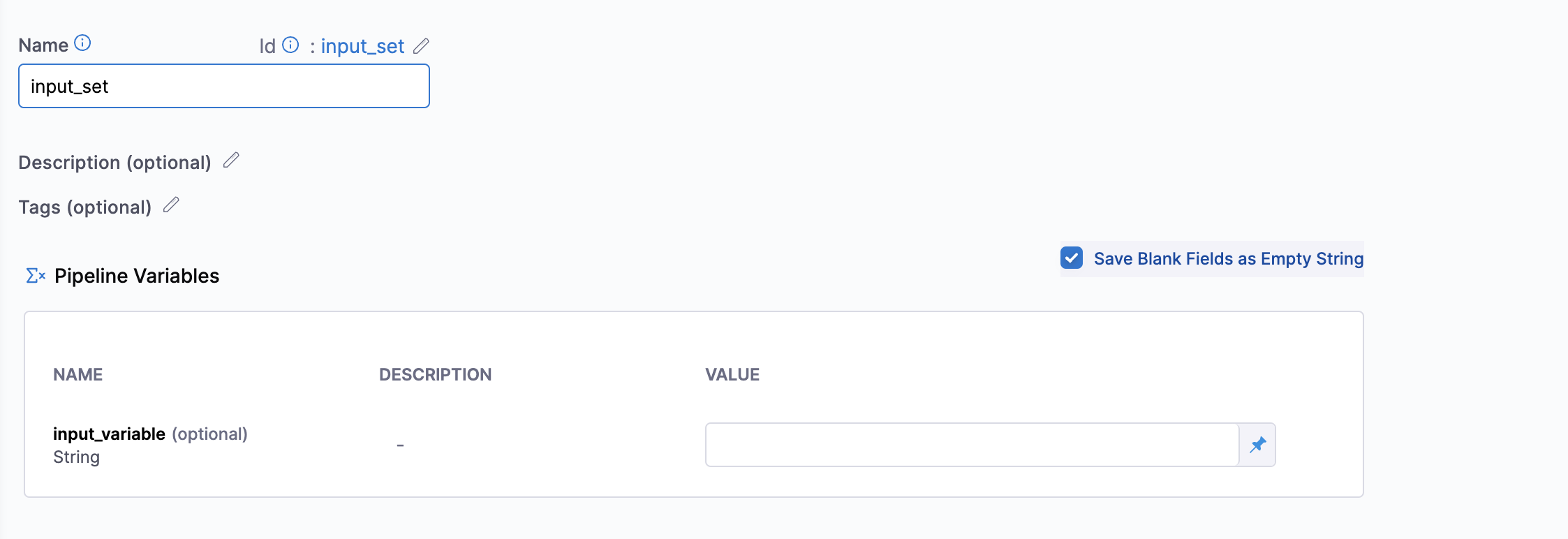 We have an input set created as well for this pipeline where we have left the value of input_variable as empty.