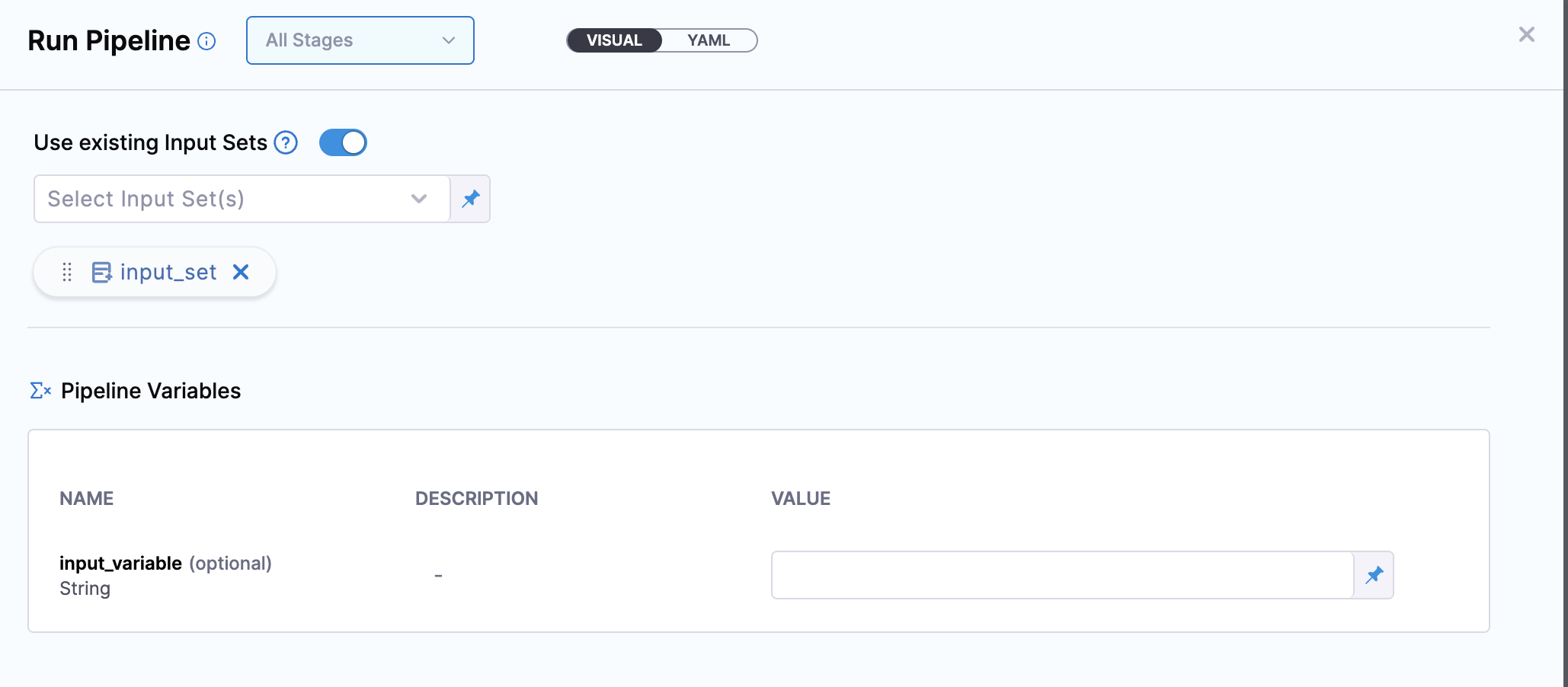 We have an input set created as well for this pipeline where we have left the value of input_variable as empty. Example yaml:-