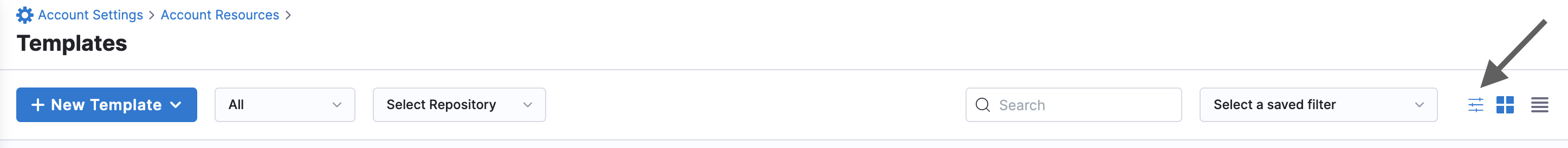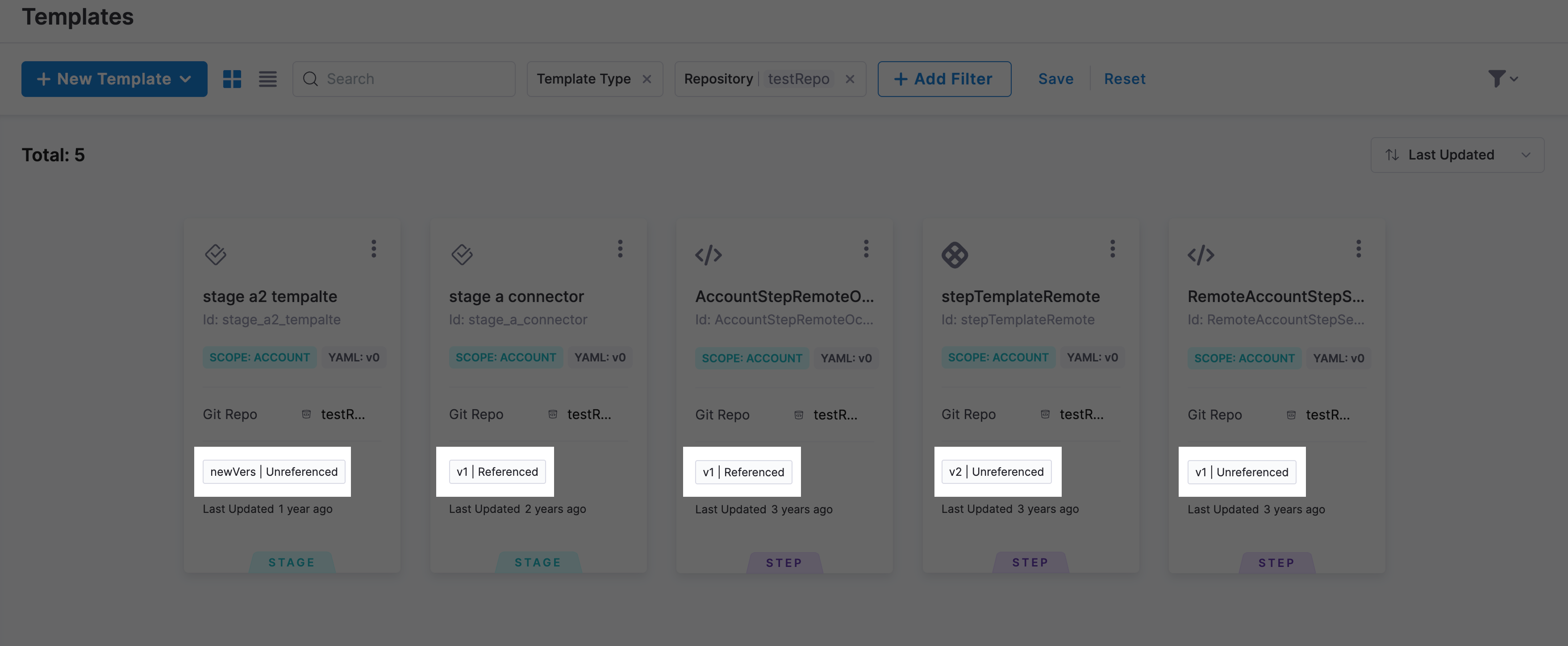 You can view all templates created under an account by navigating to Account Settings --> Templates. A comprehensive view is offered under Templates with details such as Template Name, Template Type, Scope, Repository, Version, and Template Reference for each template.