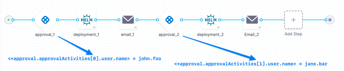 Use the index value to get information from different Approval steps in the same pipeline. For example, if you have a Deploy stage with two Approval steps, the pipeline maintains a separate set of approval variable values for each Approval step. Use the array index in the expressions to access the values for a specific approval.