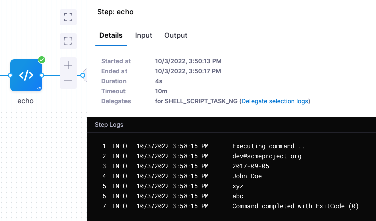 <+pipeline.triggeredBy.email>: The email of the user who triggered the pipeline. This returnsnullif the pipeline is triggered using a webhook. For more information, go to Trigger How-tos. -