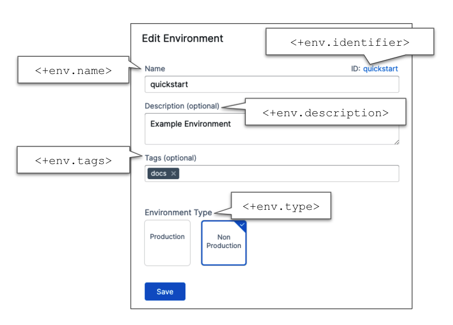 <+env.name>: The name of the environment used in the current stage.<+env.identifier>: The entity identifier of the environment used in the current stage.<+env.description>: The description of the environment.<+env.type>: The environment type, such asProductionorPreProduction.<+env.envGroupName>: The name of the environment group to which the environment belongs, if defined. This expression resolves only if the deployment is done on an environment group.<+env.envGroupRef>: The environment group reference. This expression resolves only if the deployment is done on an environment group.