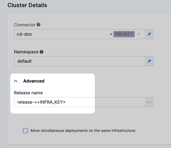 To resolve issues experienced with Kubernetes and Native Helm deployments when using the long form release-<+INFRA_KEY>, Harness now uses <+INFRA_KEY_SHORT_ID> in the default expression that Harness uses to generate a release name for the resources in Kubernetes and Native Helm deployments. This means that the Release name field, in the Advanced section of the Cluster Details in the infrastructure definition is now pre-populated with release-<+INFRA_KEY_SHORT_ID>.