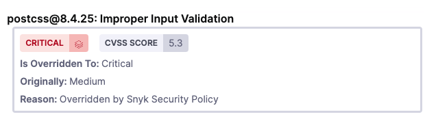 With the Snyk Step, or a Custom Scan Step utilizing a self installed Snyk runner, you can configure Harness to utilize the severity scores in a Snyk Enterprise security policy, and provide an override severity for an issue. This can be adjusted from your Snyk results, or it can also come from the snyk CLI. You can see this information in Issue Details.