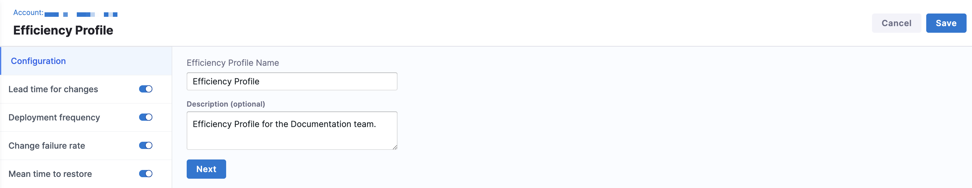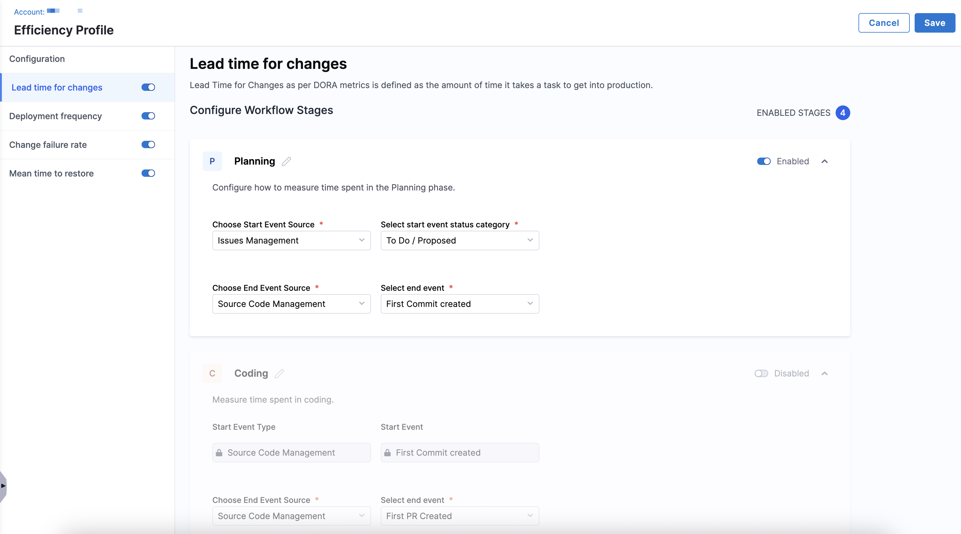 An Efficiency Profile defines how your team’s work is measured across each phase of the software delivery lifecycle. Once configured, these profiles power the core DORA metrics that help track delivery performance over time.
