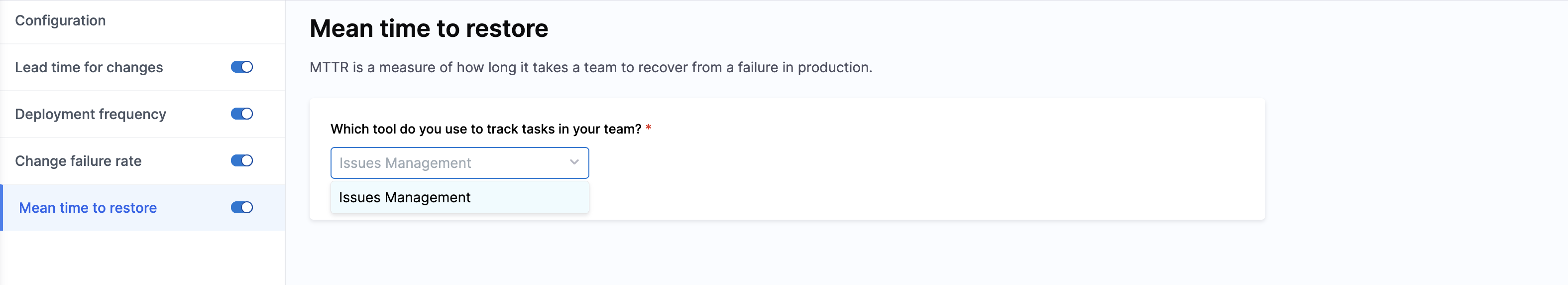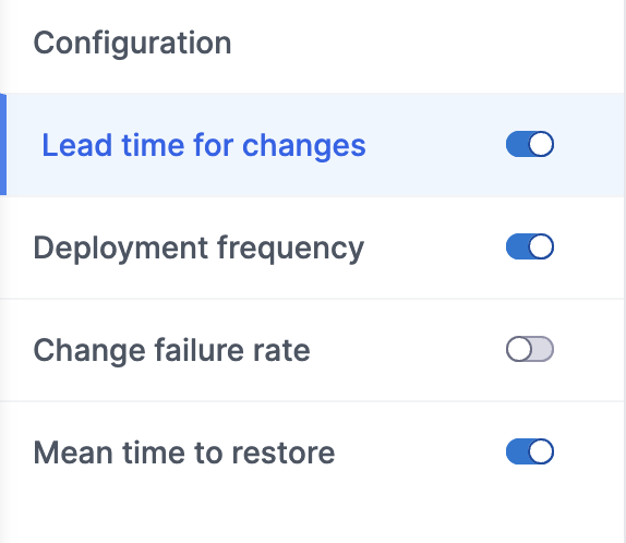 You can set up Lead Time tracking down to each engineering phase from planning all the way to deployment and configure the key signals used for Deployment Frequency, Change Failure Rate, and MTTR.