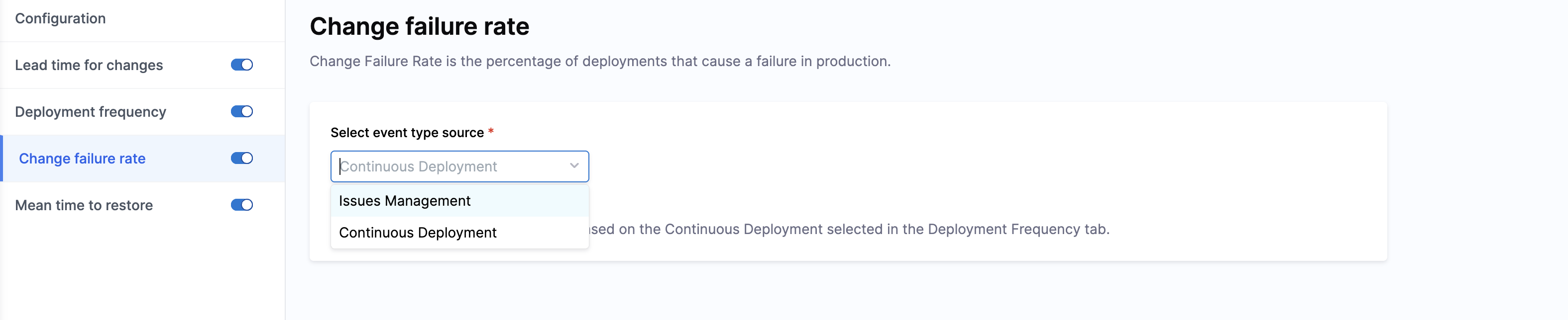 Choose the system from which SEI will detect failure events related to deployments. You can measure change failures using one of the following sources:
