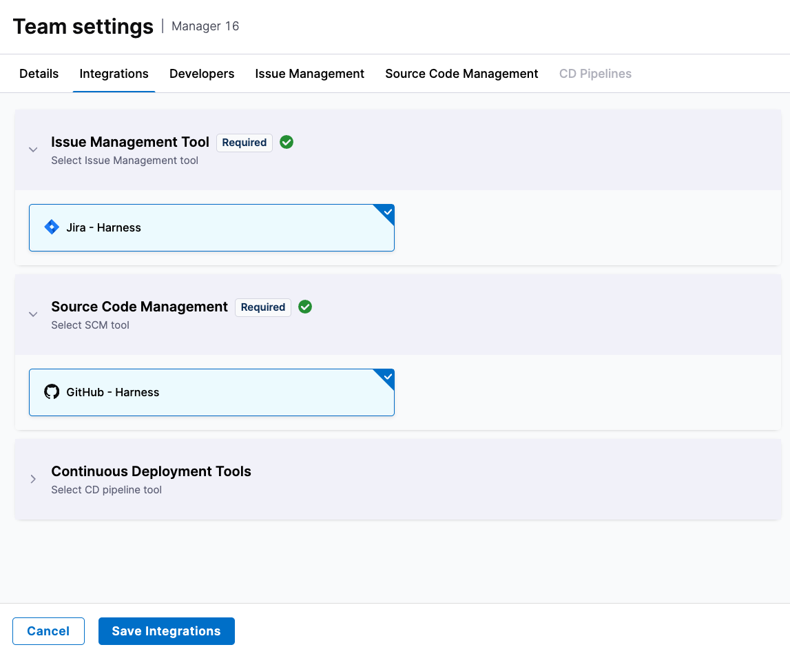 In this step, choose the integrations that is used by your team for issue management systems, source code managers & CI/CD systems. Note that it is mandatory to select and save the integrations to continue configuring the rest of the team settings.