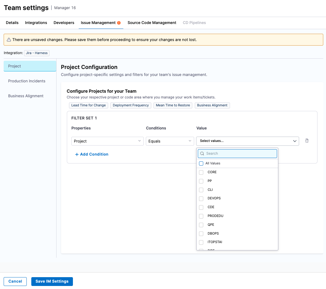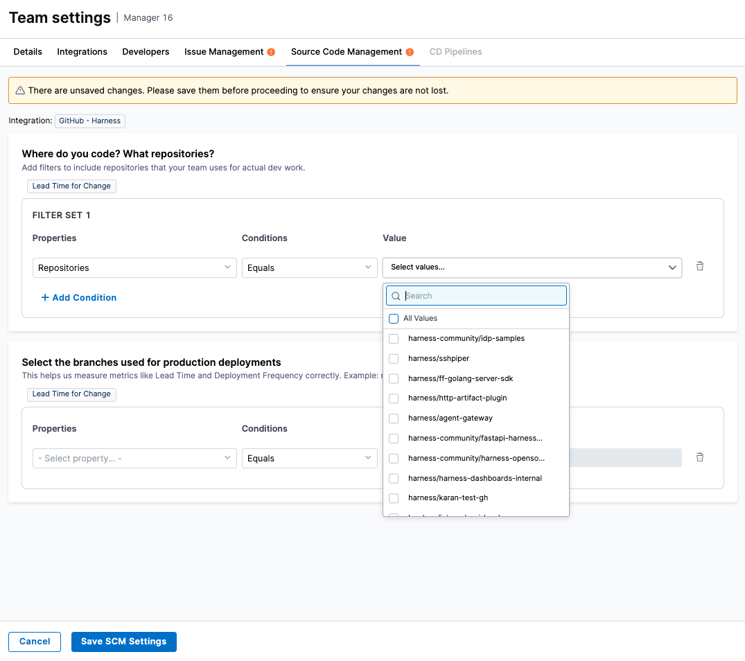 - Contextualized and metric specific settings: Teams include metadata such as associated integrations, relevant services, repositories, destination branches, pipelines, environments, etc.