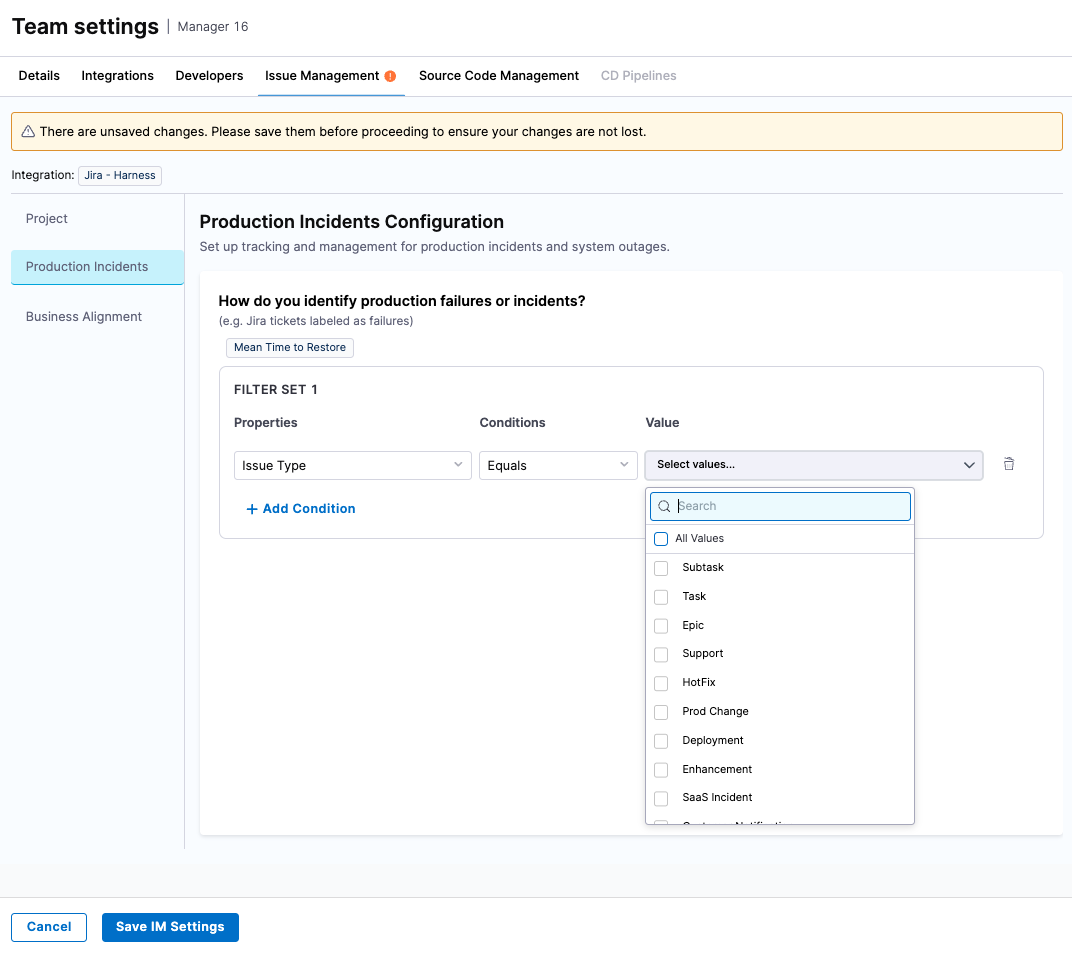 To calculate Change Failure Rate and MTTR, SEI needs to know which work items represent failures or incidents. Define this using: