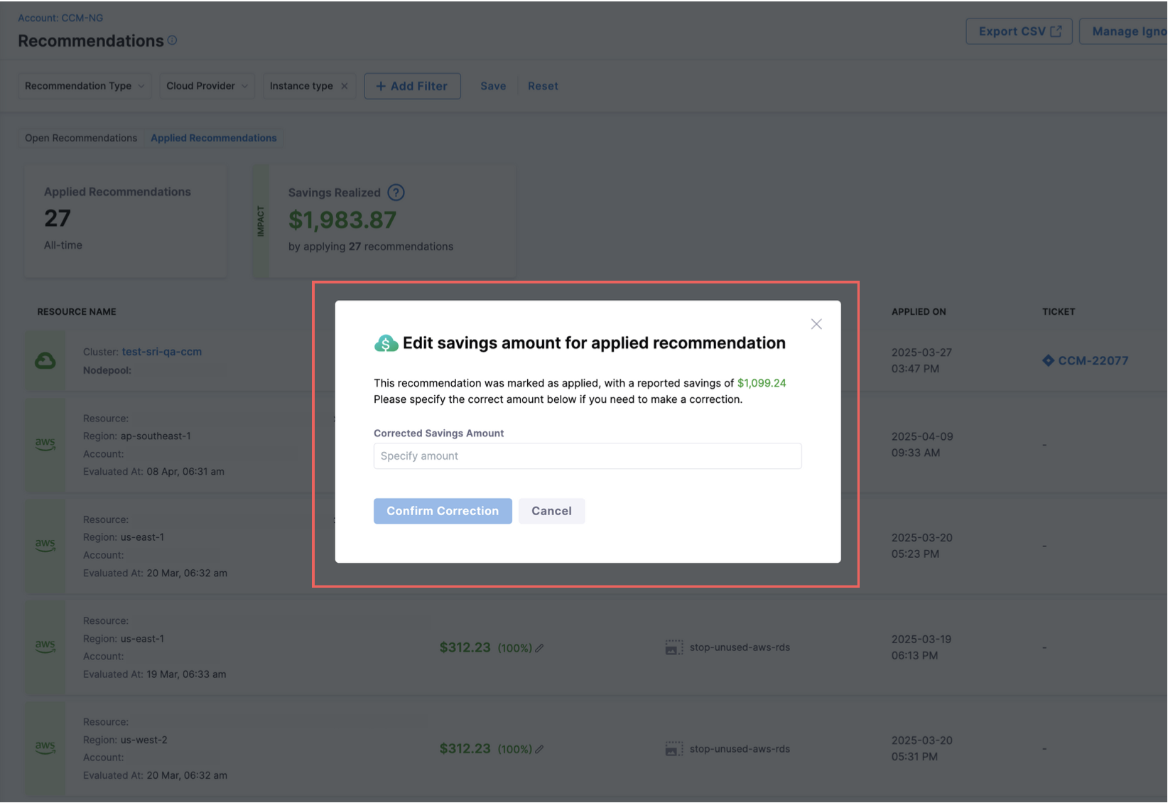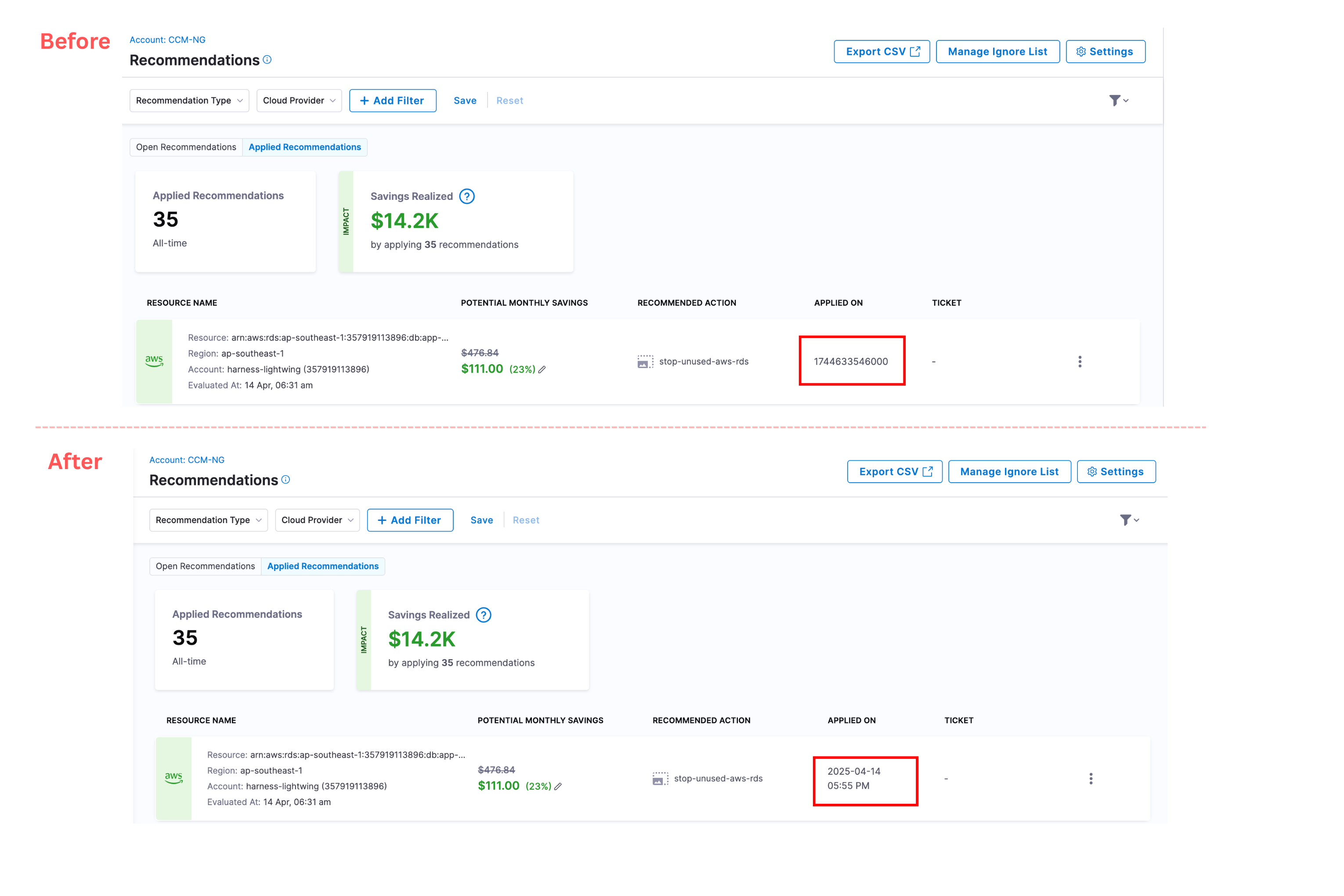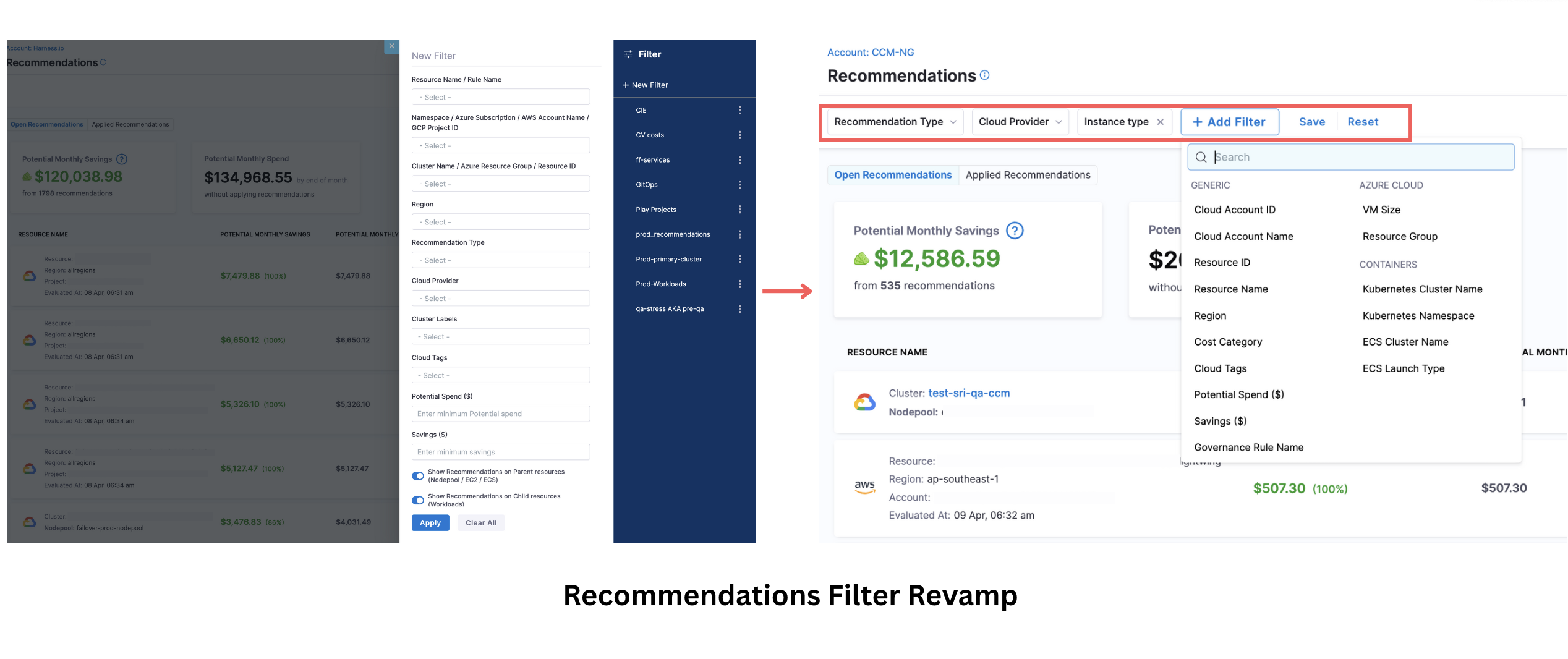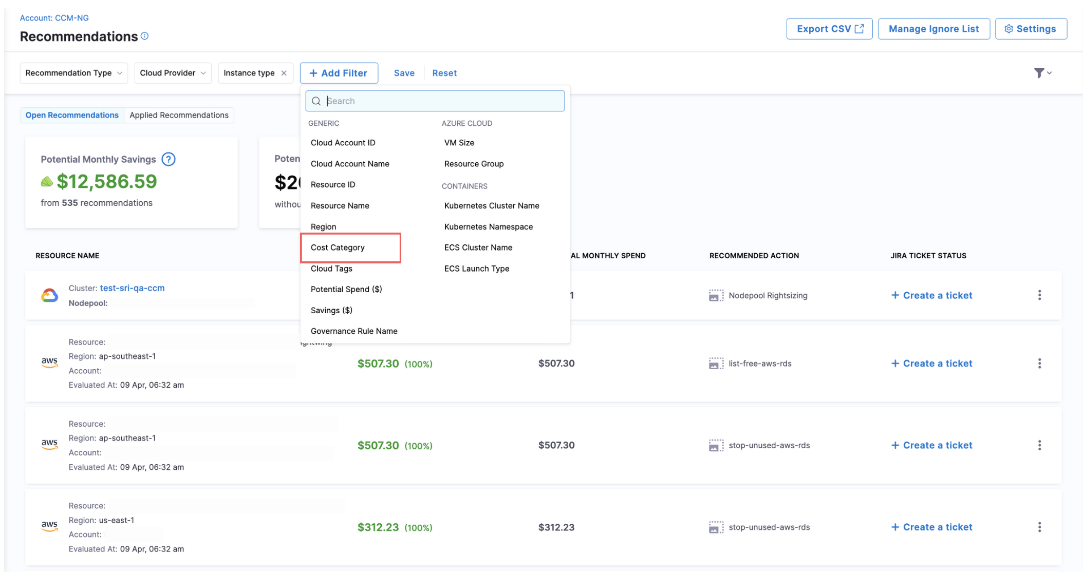 • Azure Resource Group Filtering: Added support for filtering recommendations by Azure Resource Group, aligning with Perspectives functionality and enabling more targeted cost optimization strategies. [CCM-25175]