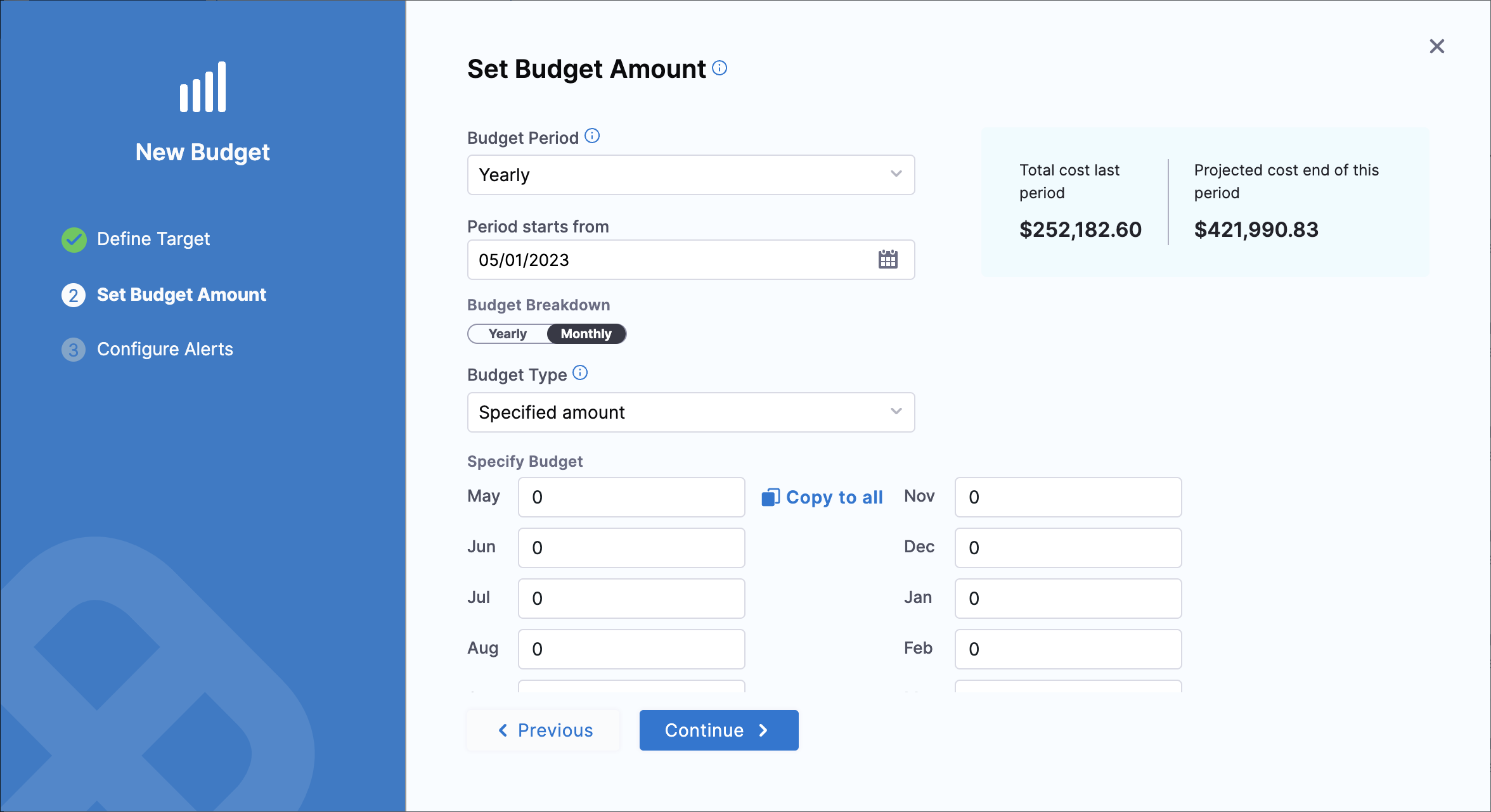 • Slack notifications for Budgets (CCM-7816) You can now set the notification channel to Slack and add multiple webhook URLs when creating a budget. For more information, refer to Create a Budget.