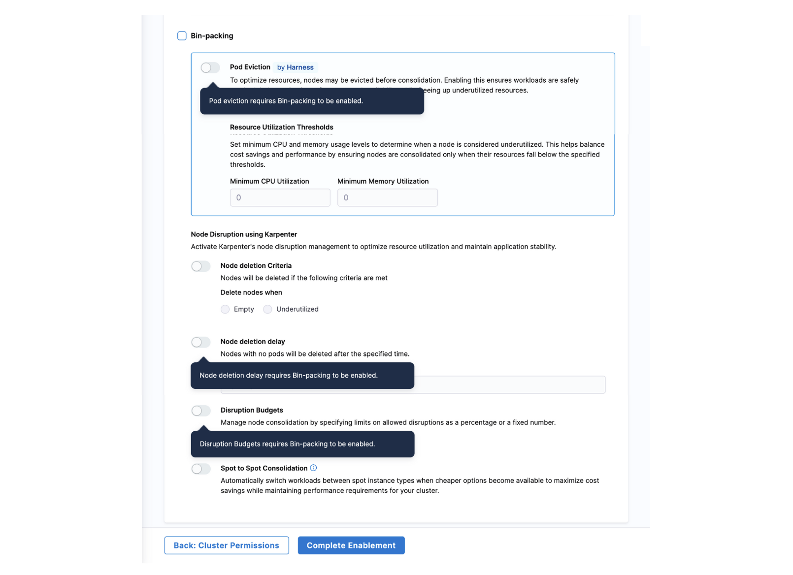 • Disable Functionality: Added support for disabling Cluster Orchestrator on enabled clusters. Disabling a Cluster Orchestrator stops all its components, removes finalizers and configurations, disables Harness-managed nodepools, and prepares the cluster for Karpenter (or any autoscaler) fallback. [CCM-25739]